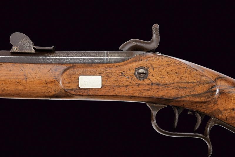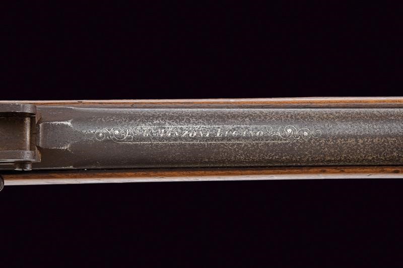 Canna tonda rigata (anima pulita, rigatura visibile) con culatta ottagonale munita di cornice in argento, dotata di mirino, alzo regolabile, recante la firma "G. MANZONI A LUGANO" in argento, cal. 10,4 mm in volata. Batteria a molla in avanti. Grilletto e stecher funzionanti. Cassa intera in legno. Fornimenti in ferro. Alloggiamento per la baionetta.