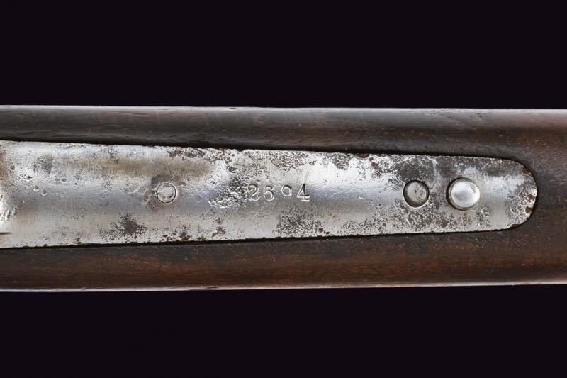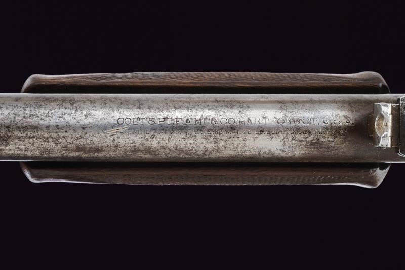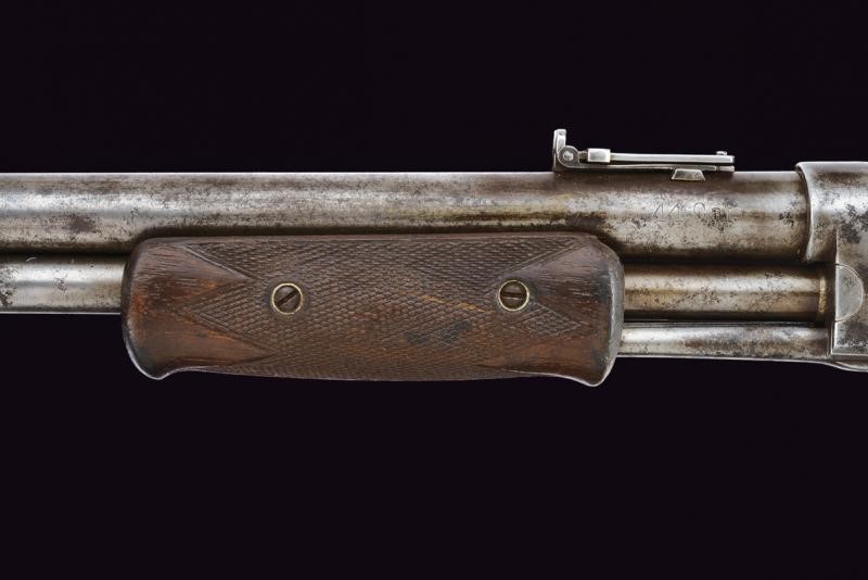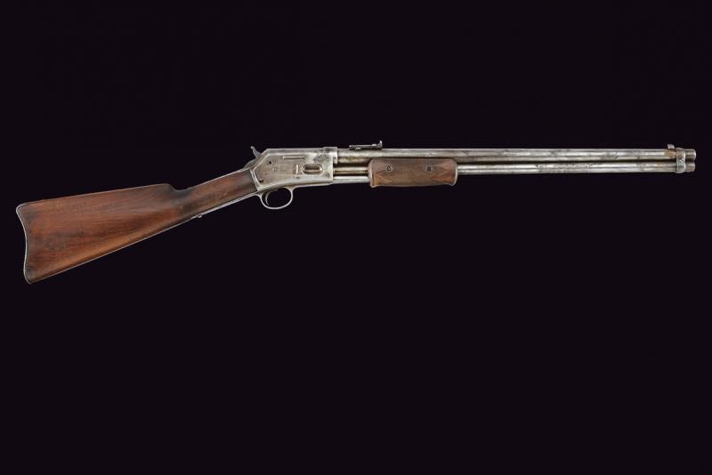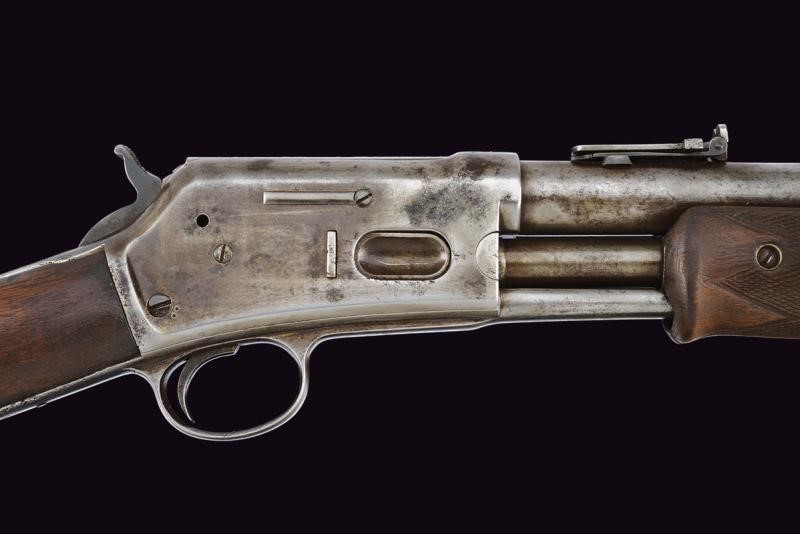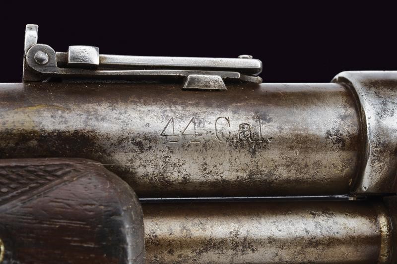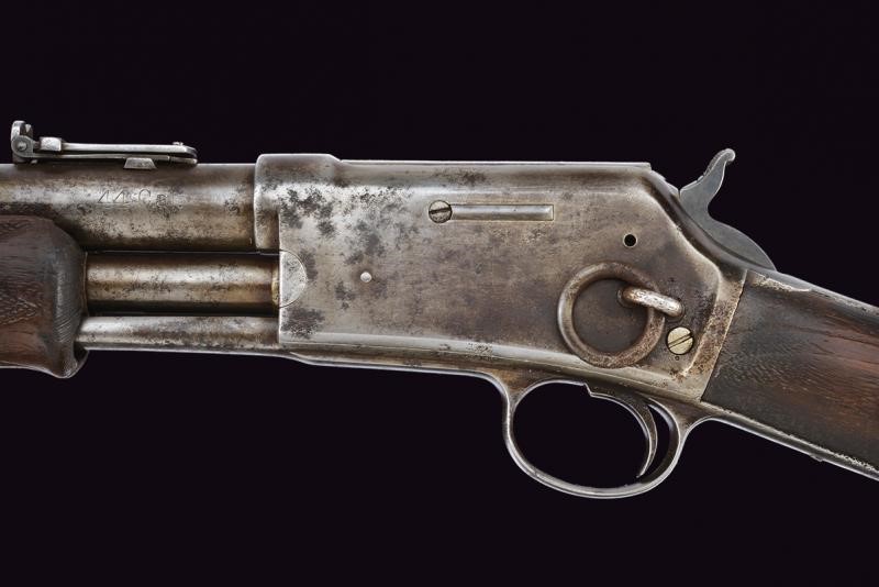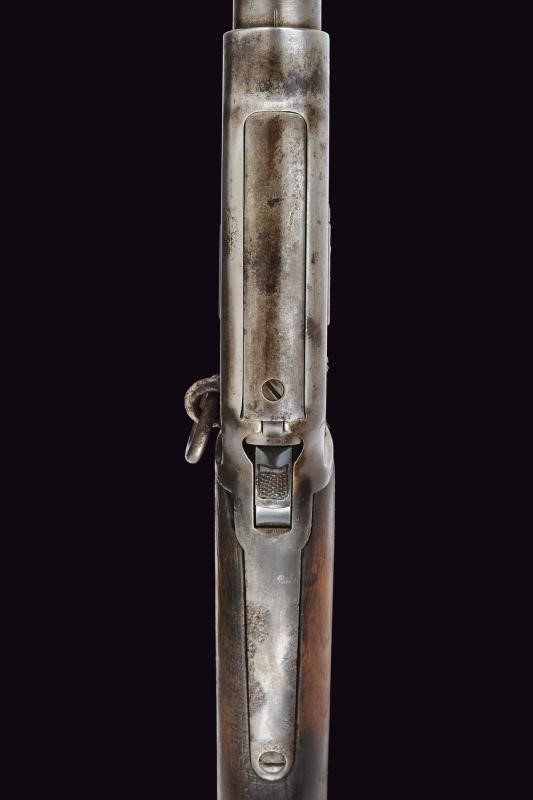 Canna tonda rigata da 20", marcata con indirizzo della ditta e con brevetti fino al 1887, dotata di mirino ed alzo abbattibile e regolabile, dicitura del calibro "44 Cal." Anima con rigatura visibile. Meccanica funzionante. Calcio ed astina in legno, la seconda zigrinata. Matricola nel codolo inferiore "326xx". Anello da sella. Zone con incrostazioni e danni da ruggine.