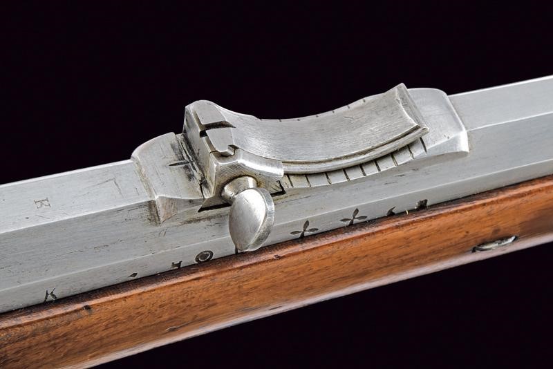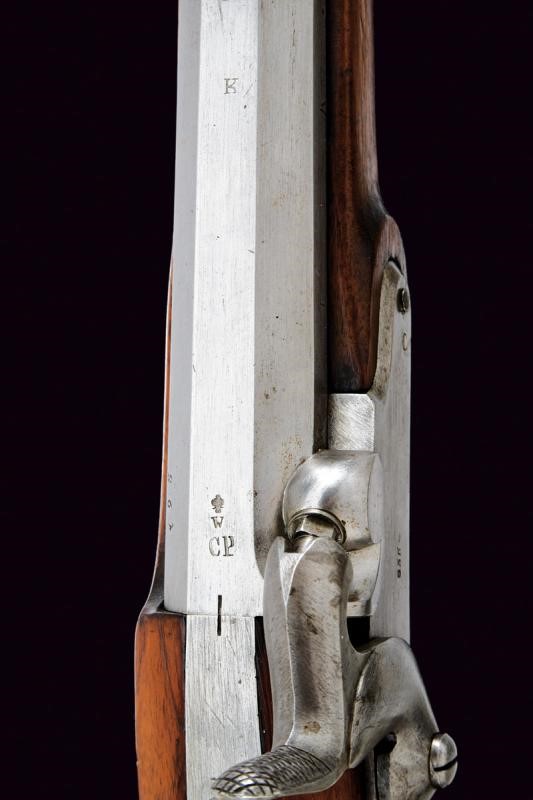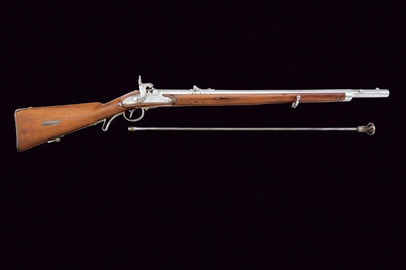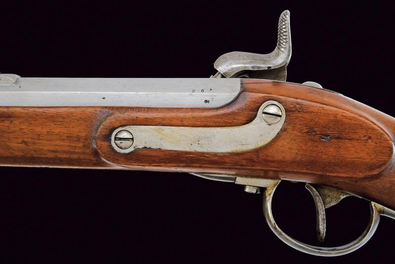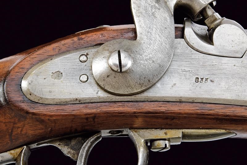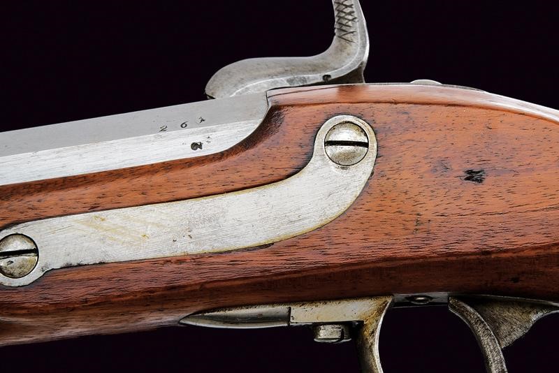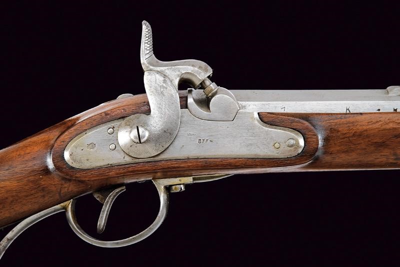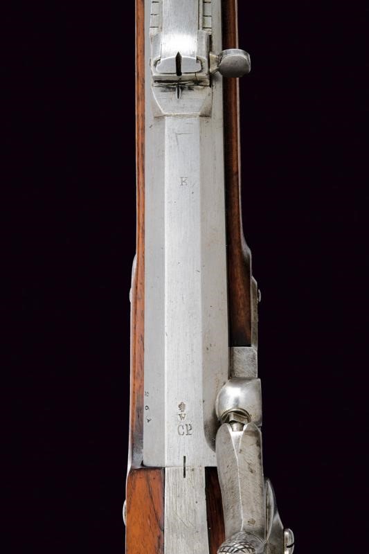 Canna ottagonale rigata (anima pulita, rigatura ben visibile), con volata circolare, marcata alla base "CP" sotto "W" e con aquila imperiale, varie altre marcature sul fianco; alzo regolabile (Bogenvisier), dente d'innesto per baionetta e mirino. Cal. 14 mm. Batteria a molla in avanti datata "855" e con punzone ad aquila imperiale. Cassa intera in legno. Fornimenti in ferro; il codolo del calciolo marcato "261" e "P". Completo della bacchetta disgiunta, in ferro, con anello di ottone e impugnatura in legno.