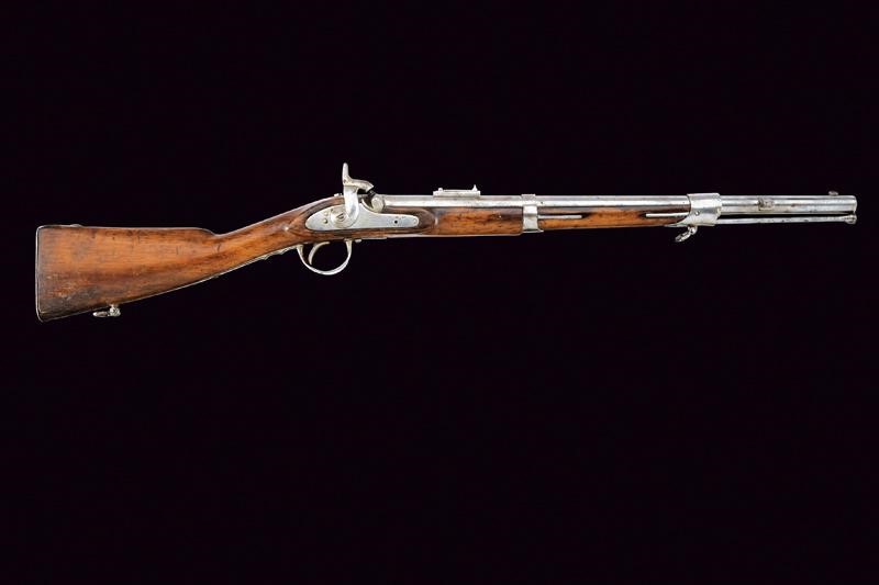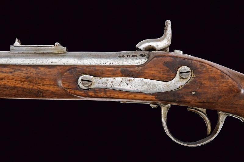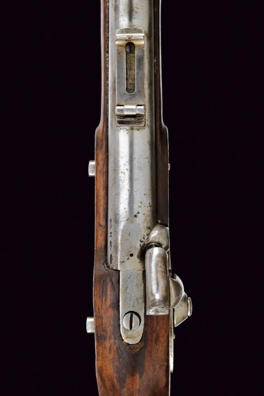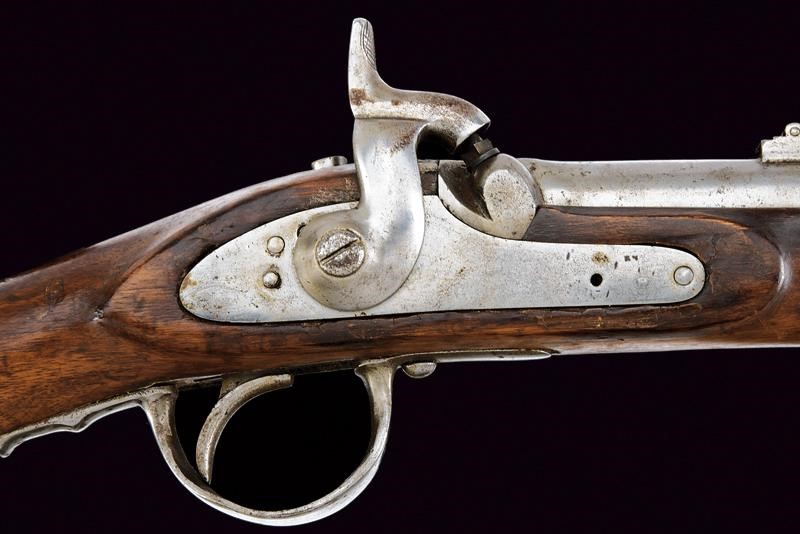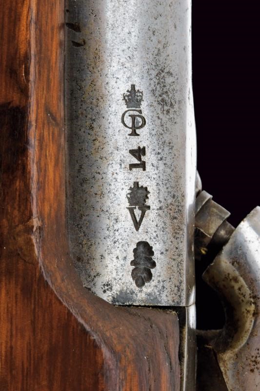 Corta canna tonda, rigata, con punzoni del banco di prova di Londra alla base, traguardo regolabile e abbattibile, mirino, attacco per la baionetta laterale, cal. 17 mm. Batteria a molla in avanti con cartella piatta. Meccanica funzionante. Cassa in legno con fornimenti e bacchetta in ferro. Raro.