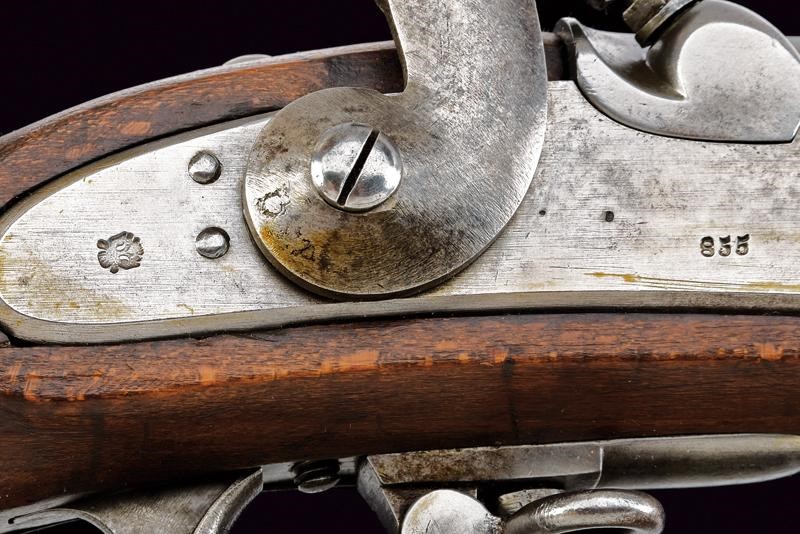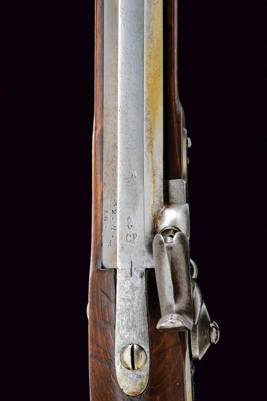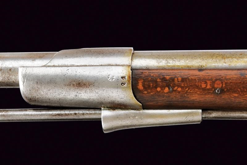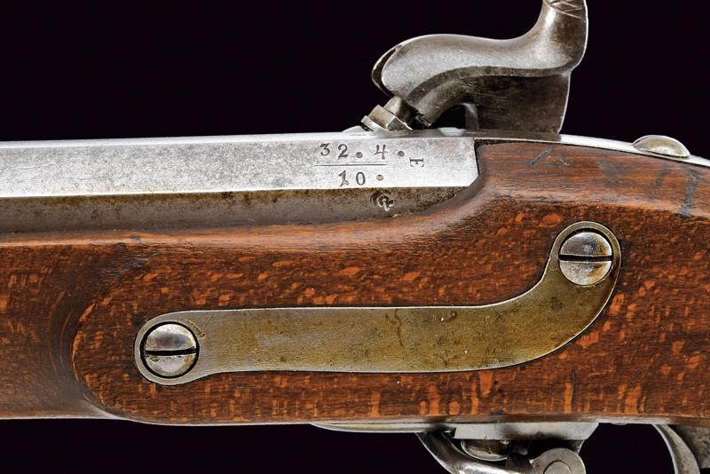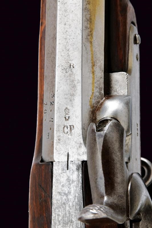 Canna tonda rigata (anima pulita, rigatura visibile), con base ottagonale marcata "CP" sotto "W" e con aquila imperiale, con dicitura "31. 4. 10", "R" e con altri punzoni e marcature al fianco, dotata di alzo abbattibile e mirino, cal. 13.9 mm. Batteria a molla in avanti datata "855" e con punzone imperiale. Cassa intera in legno con fornimenti e bacchetta in ferro. Il calciolo con numeri di reparto coevi alla canna.