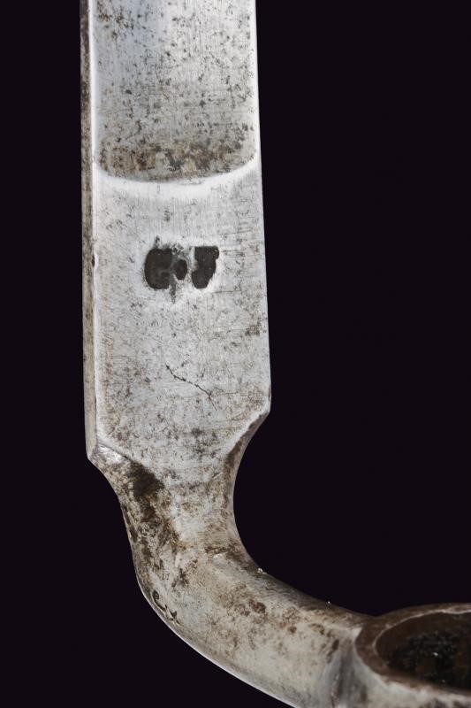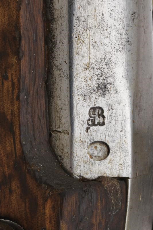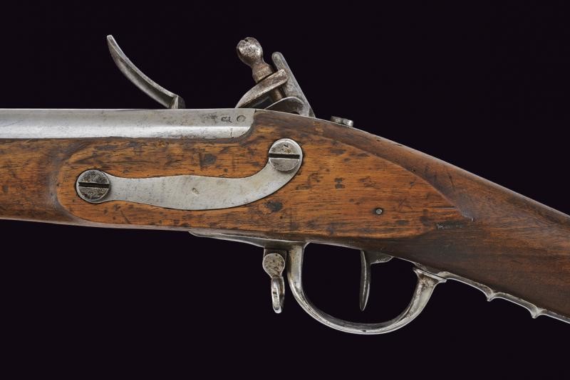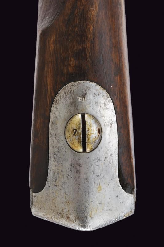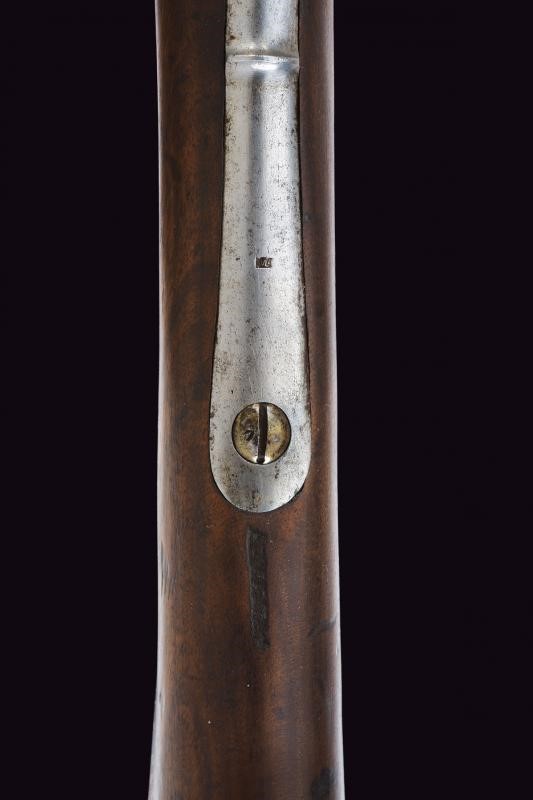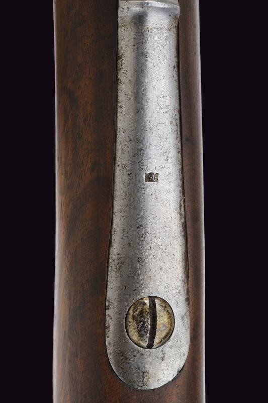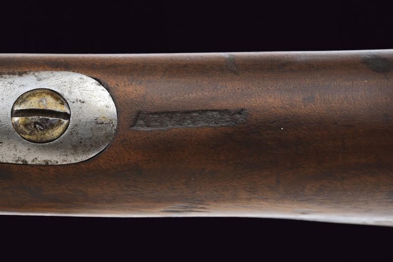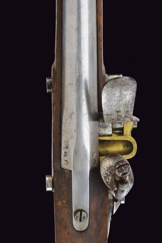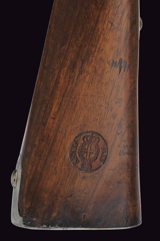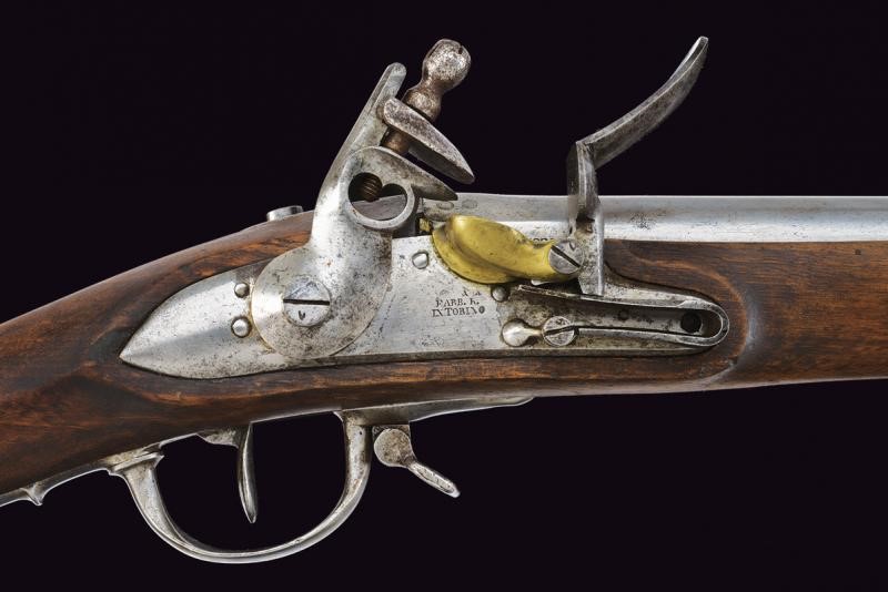 Canna tonda liscia, con base quadra punzonata, cal. 17 mm. Batteria a cartella piatta marcata "FABB.A R.A IN TORINO", scodellino in ottone. Cassa intera in legno con timbro piemontese del 1833, fornimenti e baionetta in ferro. Bacchetta mancante.