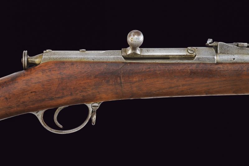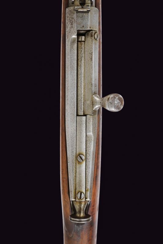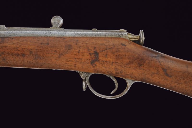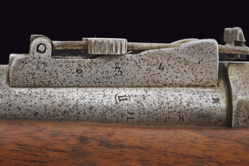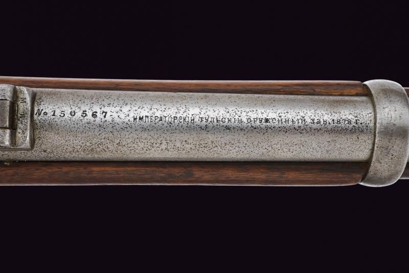 Canna tonda rigata (anima con leggero pitting, rigatura ben visibile), dotata di dente d'innesto per baionetta, mirino e alzo regolabile e abbattibile, recante marcatura della manifattura imperiale di Tula in cirillico, vari punzoni, data "1878" e matricola "150xxx", cal. 11 mm. Otturatore girevole-scorrevole con breve impugnatura periforme. Cassa intera in legno, con fornimenti in ferro. Bacchetta mancante, baionetta in ferro.