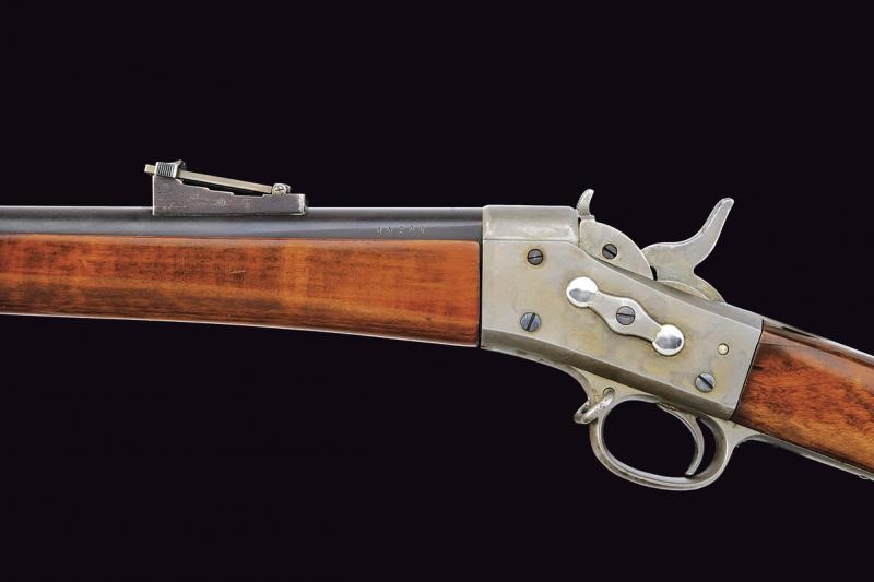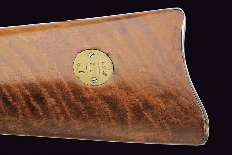 Canna tonda rigata (anima pulita, rigatura ben visibile), marcata alla base "C" sotto corona, "PIF", con numero di matricola "14xxx", dotata alzo variabile ed abbattibile, dente d'innesto per baionetta e mirino, cal. 12 mm in volata. Castello liscio, codetta con marcatura "Remington" e brevetti fino al 1866. Meccanica funzionante. Calcio ed astina in legno, una guancia con disco in ottone marcato "1R 5K NO 57". Fornimenti e bacchetta in ferro. Alcuni fornimenti marcati "U".