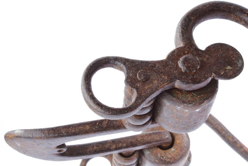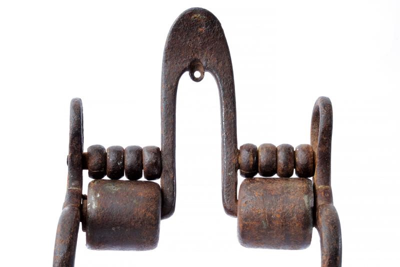 In ferro, con lunga imboccatura a "U", i lati con quattro anelli mobili e un grande rullo dietro ad essi. Guardie a "S" e traversa fissa di sezione quadra.