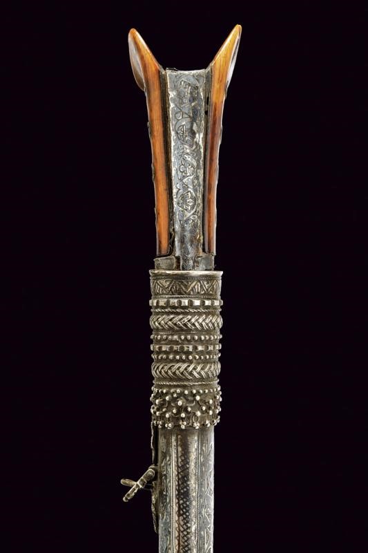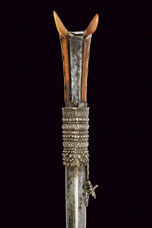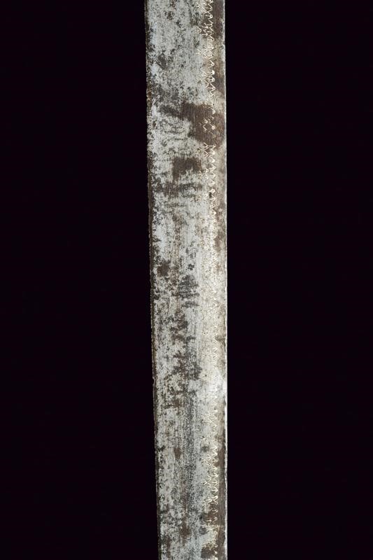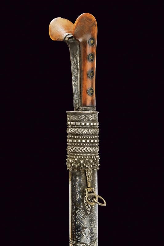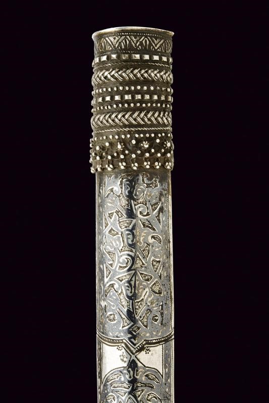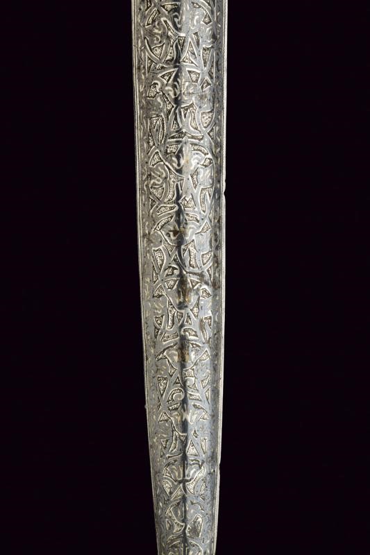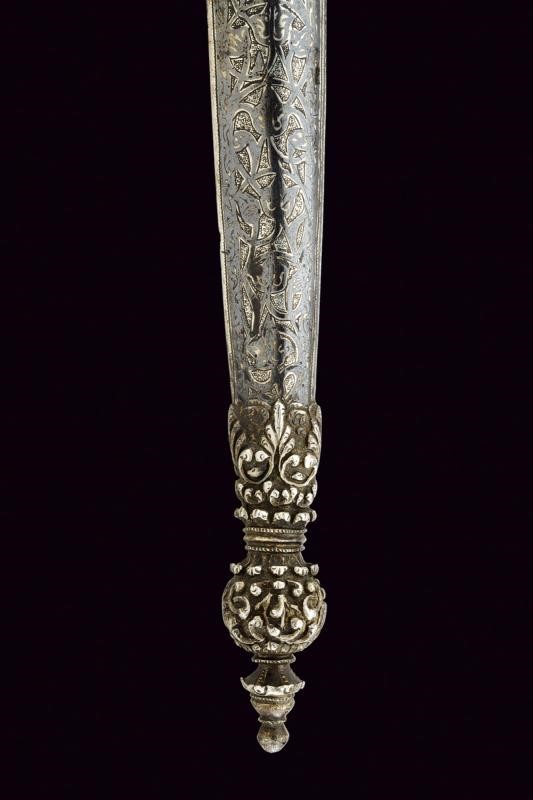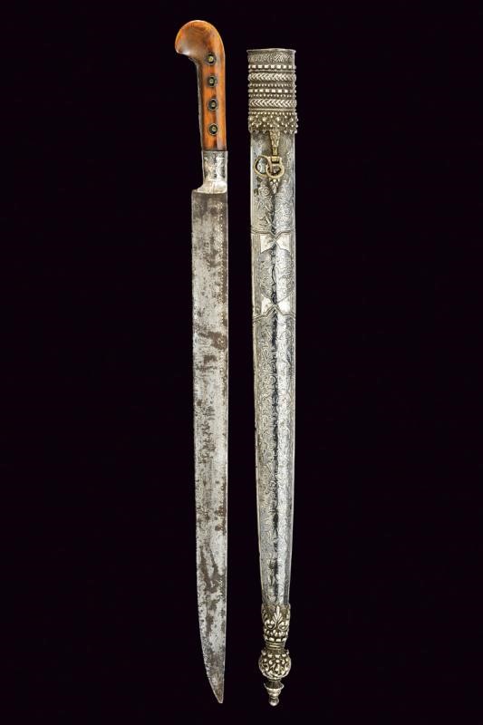 Straight, single-edged blade (areas damaged by rust), decorated on both sides and along the entire length with small silver-inlaid arrowheads (missing parts). Hilt covered with silver foil, engraved with floral motifs (signs of use and time), deer horn grip scales (a small missing part). Beautiful wooden scabbard completely covered with silver, richly engraved and decorated with nielloed floral and geometric motifs; decorated with bands and floral motifs in bas-relief at the ends. Suspension ring.