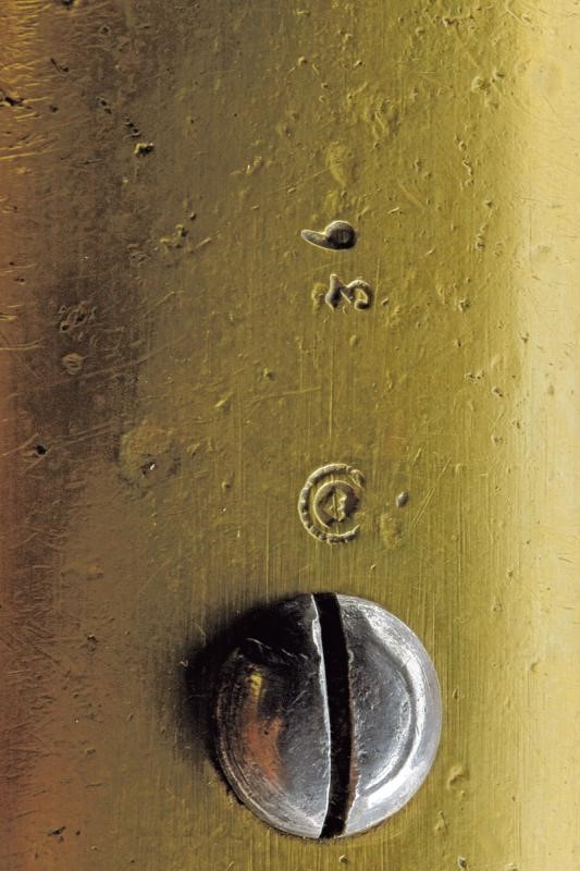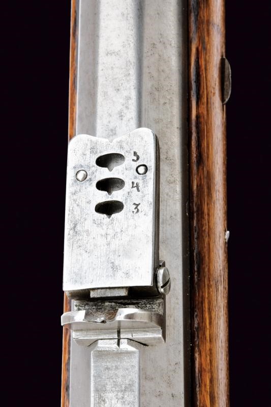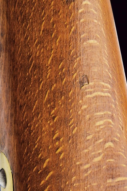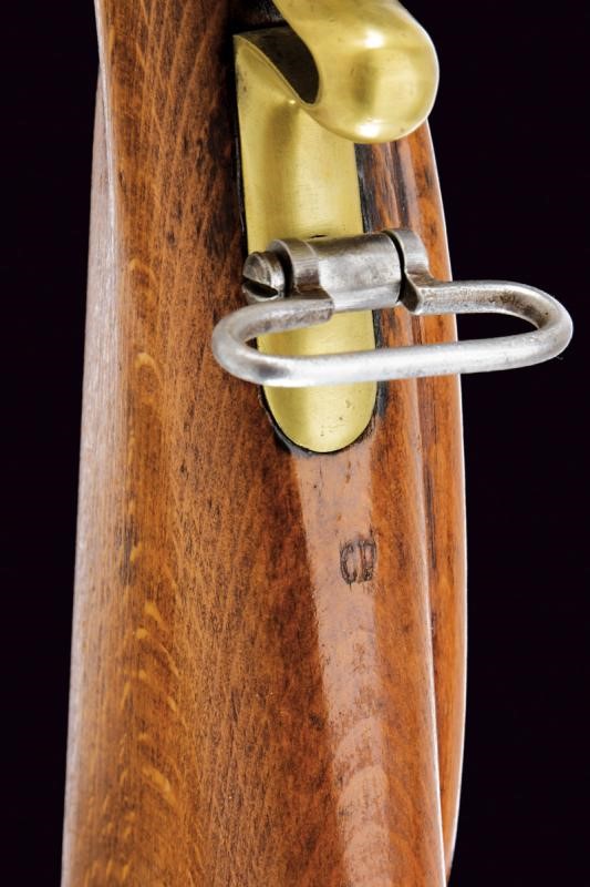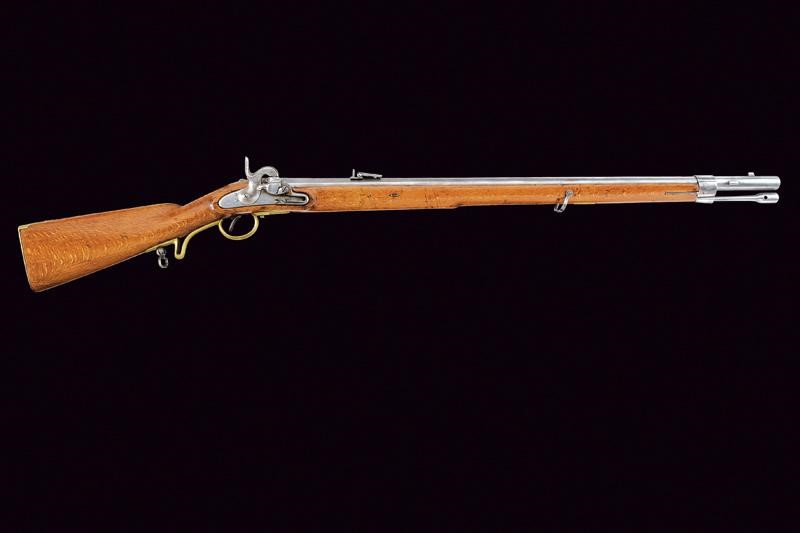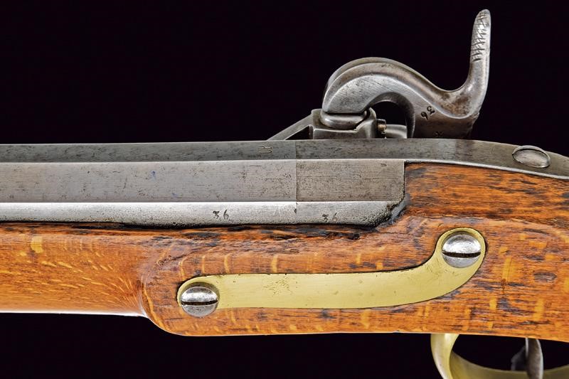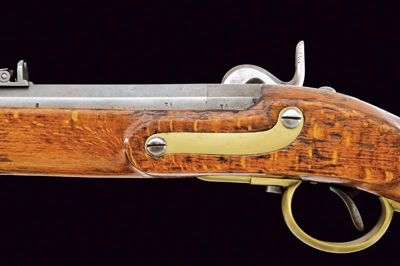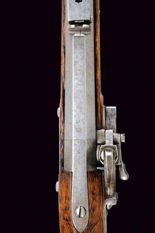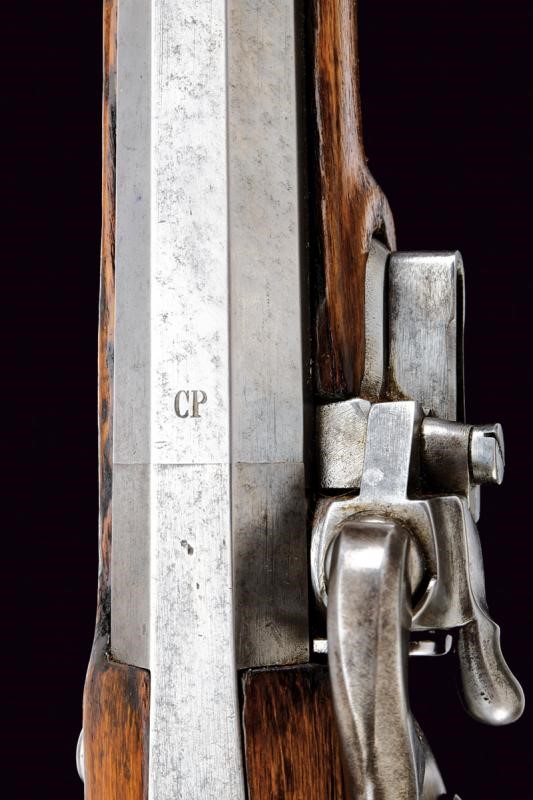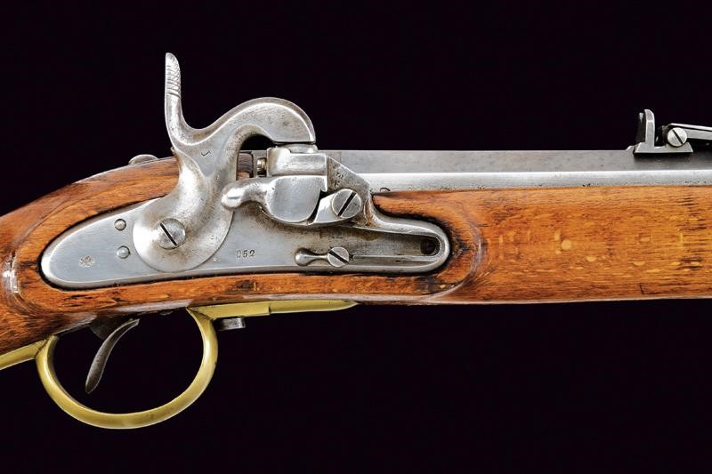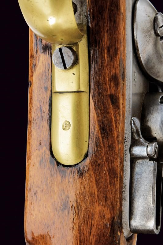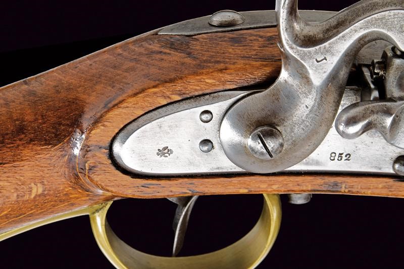 Canna tonda con base ottagonale, marcata al dorso "CP". L'anima con leggere incrostazioni e rigatura ben visibile. Alzo abbattibile, mirino e dente d'innesto per la baionetta; cal. 18.1 mm. Batteria con sistema Augustin datata "852" e con punzone imperiale. Cassa intera in bel legno chiaro, sotto al calcio la marcatura "CP". Fornimenti in ottone e bacchetta originale in ferro. Molto raro.