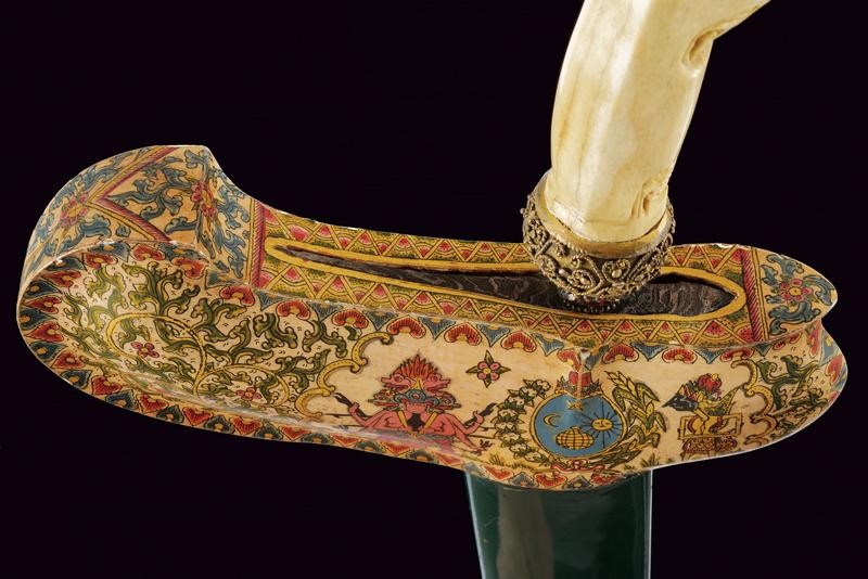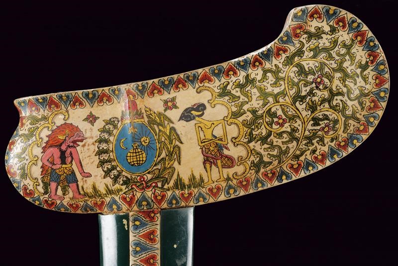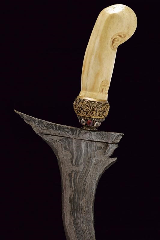 Pamor, double-edged, wavy blade (probably older) with carved base. Bone ukiran, slightly carved with floral motifs, mendak and selut made of metal decorated with stones and filigree. Warangka painted in polychrome with divine figures and floral and geometric motifs. Pendok made of lacquered metal (small missing parts) with central band in painted wood.