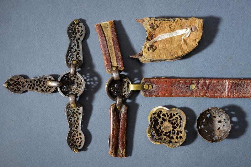 All made of gilded iron and richly perforated with floral motifs. Two perforated, one made of leather, the other made of fabric.
