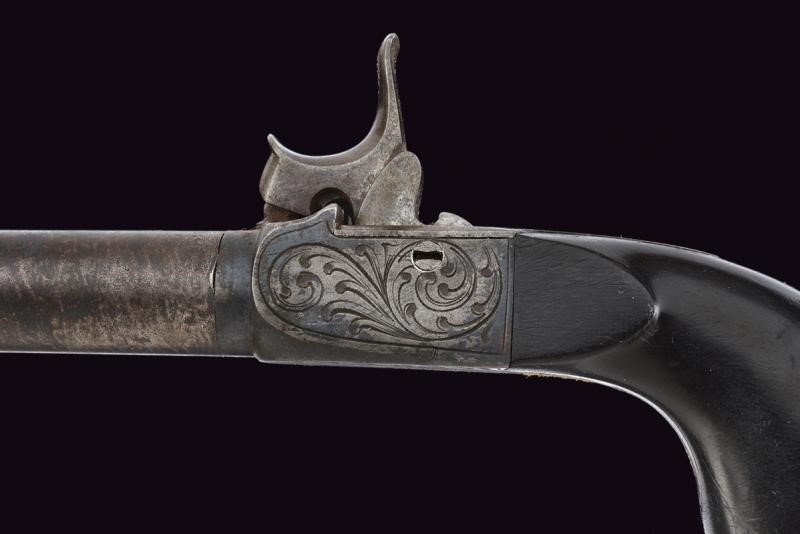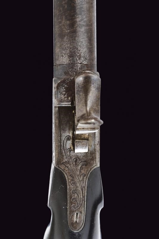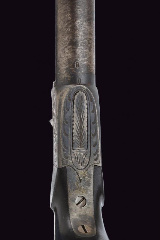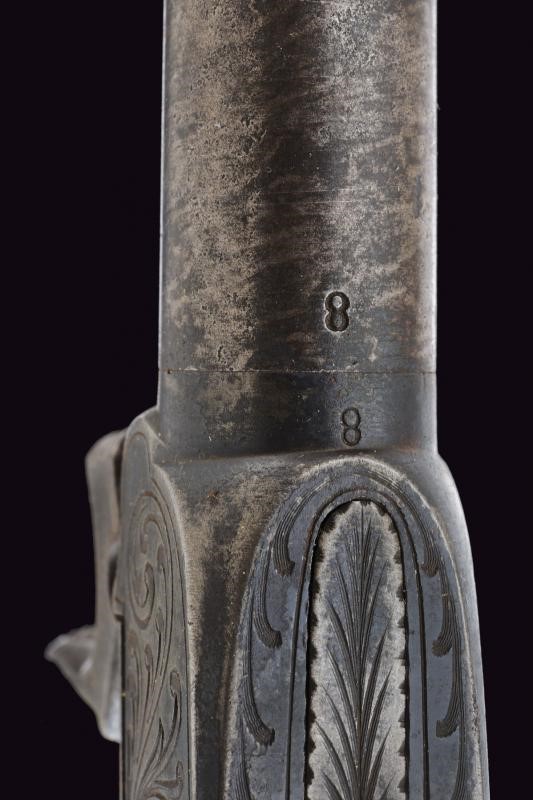 Canna tonda rigata, marcata "8", cal. 12 mm; castello del tipo boxlock inciso a motivi floreali, con grilletto a scomparsa, cane decentrato, mirino, codetta incisa, calcio a goccia, meccanica funzionante. Nella sua rarissima custodia in pelle.