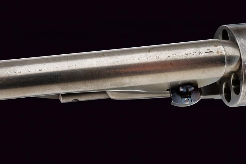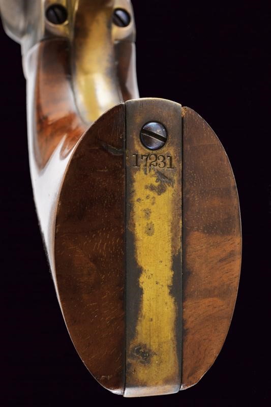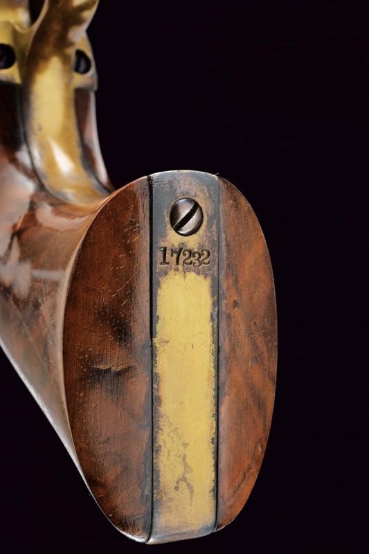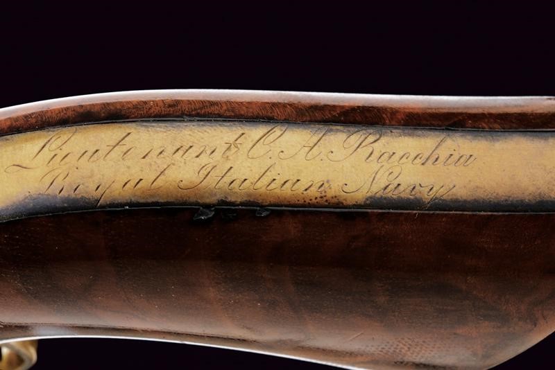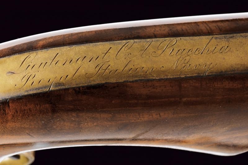 Canne tonde rigate (anime ben conservate con rigature ben definite), recanti marcature della ditta (non chiaramente visibili in una canna), cal. 36. Tamburi a sei colpi con incisione della battaglia navale ben visibile e con marcature dei numeri di serie. Castelli marcati "COLTS PATENT". Leve dei calcatoi con estremità zigrinate. Impugnature in noce con bande e ponticello in ottone con resti di argentatura. Meccaniche ben funzionanti. Entrambe le pistole con matricole coeve su canna, castello, ponticello, impugnatura, perno del tamburo, su fermo della canna e tamburo sempre la matricola coeva ma abbreviata. Un castello marcato all'interno "P", l'altro "P2". I ponticelli marcati entrambi "S" e "36 CAL". Il dorso dei calci marcato in corsivo "Lieutenant C.A. Racchia / Royal Italian Navy". I cani con brunitura forse rinfrescata. Minimi segni d'uso. Forse lievi tracce di tartarugatura sui castelli. Conservate in una cassetta di legno foderata all'interno di velluto rosso.