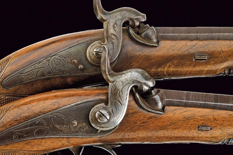 Canne ottagonali, microrigate (anime pulite, rigatura ben visibile), damascate, con mirino, cal. 11.5 mm; codette incise e munite di alzo. Batterie a molla indietro incise a motivi floreali. Mezze casse in legno con collo zigrinato, fornimenti in ferro decorati en suite. Bacchette in ferro.