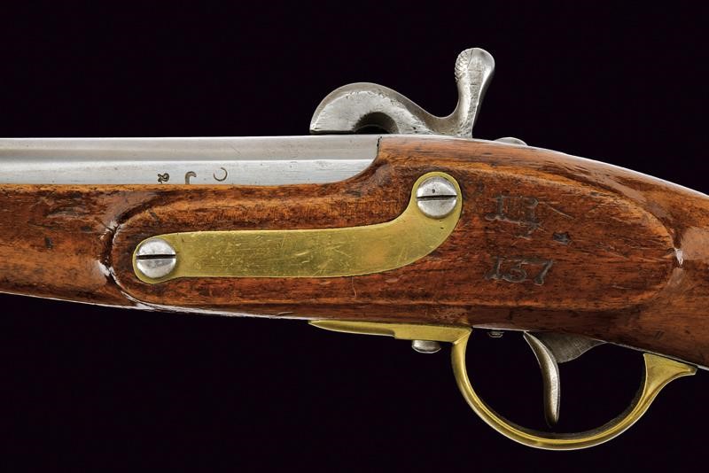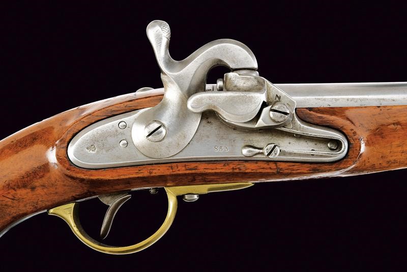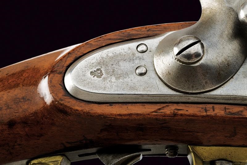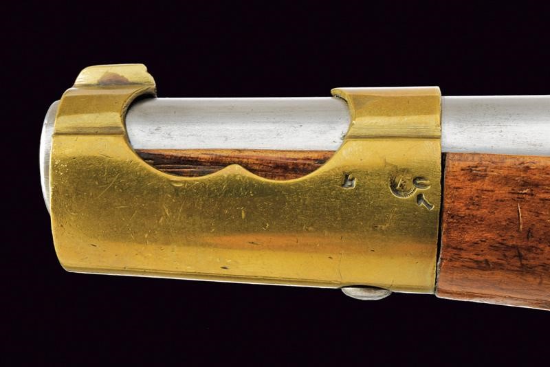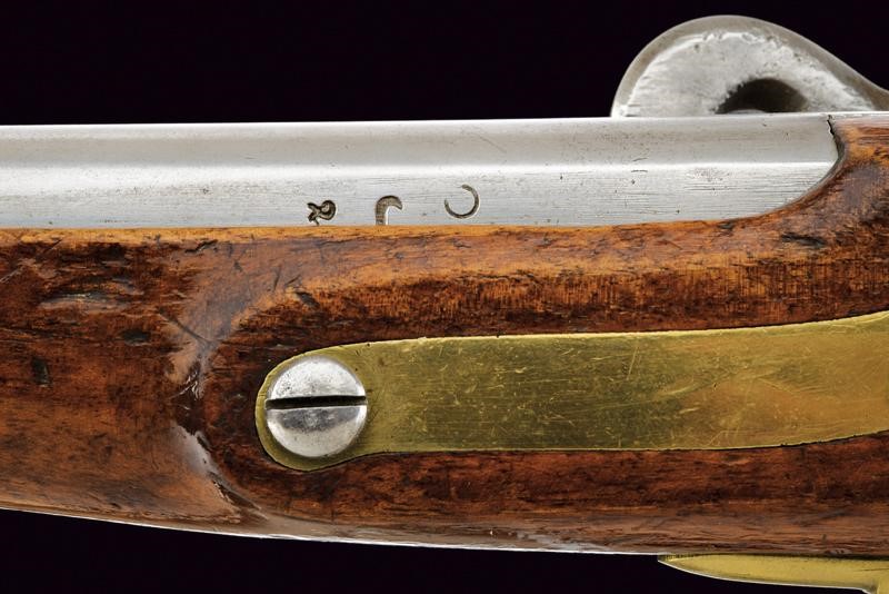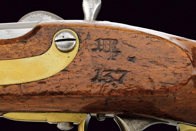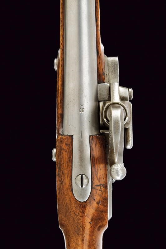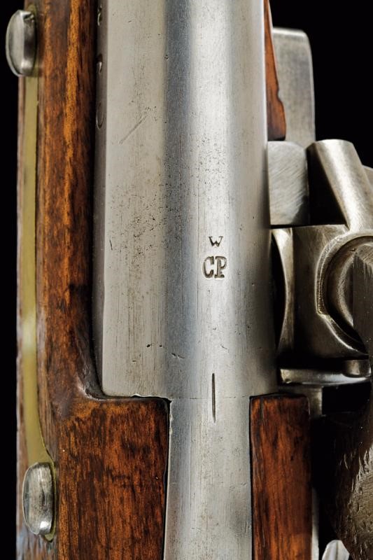 Canna tonda liscia, con base marcata "CP" sormontata da una "W", sul lato sinistro altre marcature, cal. 17 mm; codetta liscia. Batteria a molla in avanti con sistema "Augustin", cartella datata "853" e punzonata con aquila bicipite; cassa in legno con timbri alla contropiastra. Fornimenti in ottone, la fascetta marcata "10" e con due punzoni. Rara.