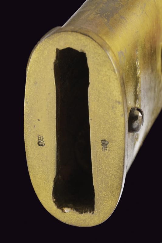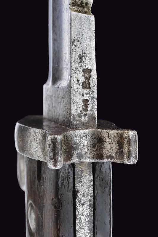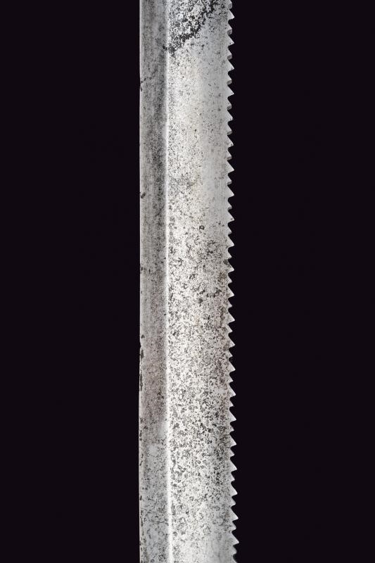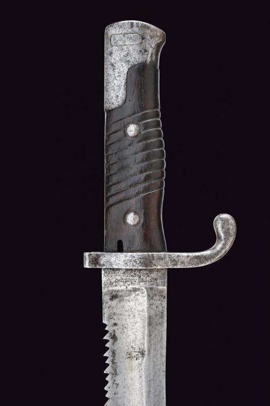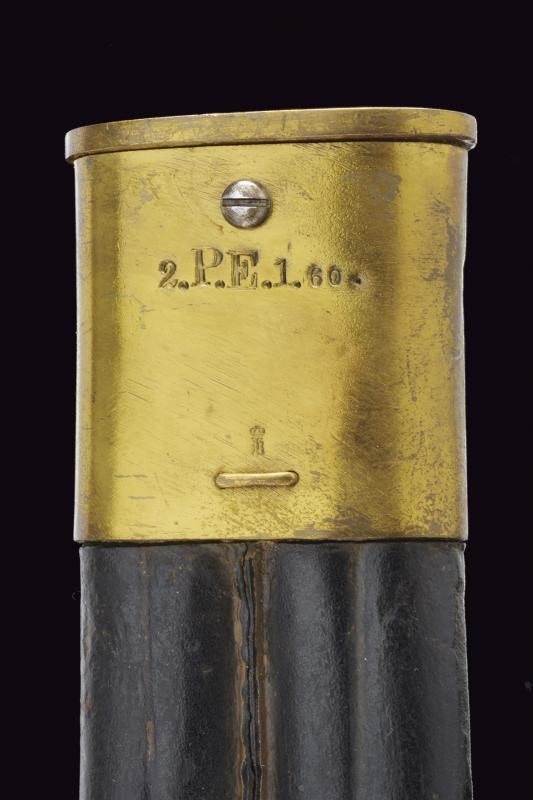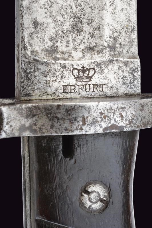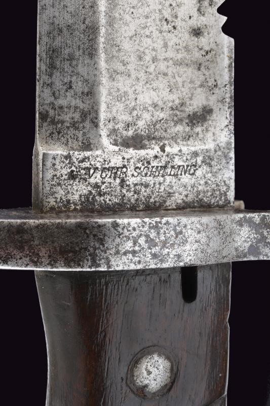 Lunga e robusta lama sgusciata su entrambe le facce, con dorso a sega (intaccature e un paio di denti al filo). Tallone con punzone a corona soprastante la dicitura "ERFURT" su una faccia, sull'altra resti di marcatura "V. CHR SCHILLING ... " (il resto non leggibile). Il dorso punzonato con "W" coronata soprastante il numero 01 e con "C" coronata. Crociera in ferro. Massiccia impugnatura con guancette in legno. Pulsante a molla funzionante. Resti di punzoni. Fodero in cuoio con fornimenti in ottone, cappetta con numeri di reparto "2.P.E.1.60."