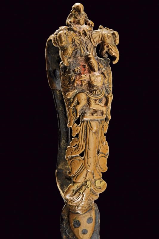 Short, curved, iron, double-edged blade with central groove, nice, bronze grip with Krishna playing the flute, two Yali dragons and monkey god Hunuman.