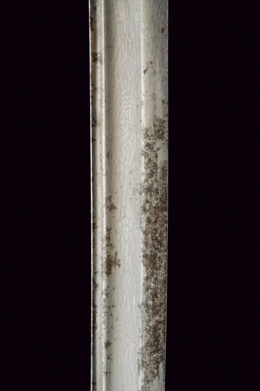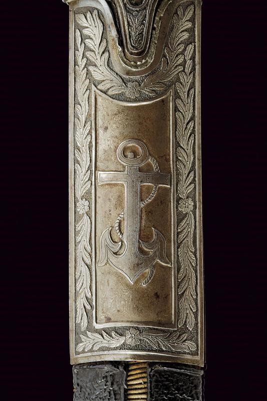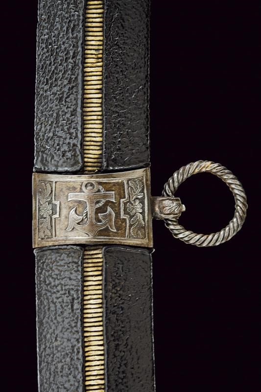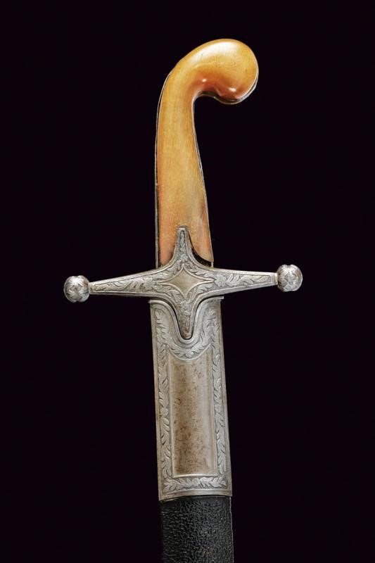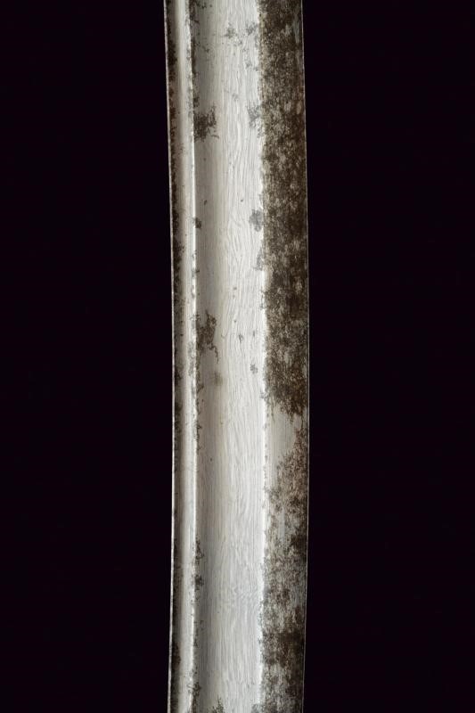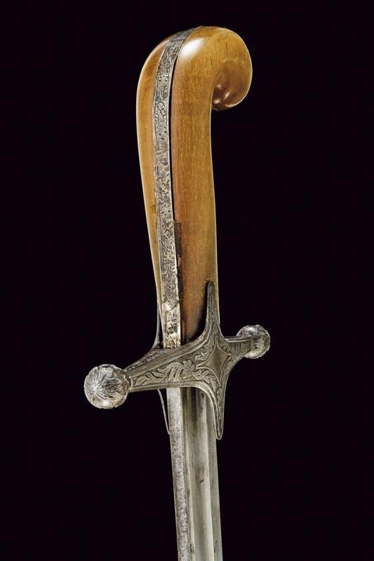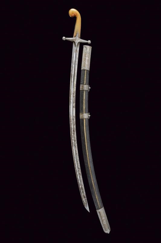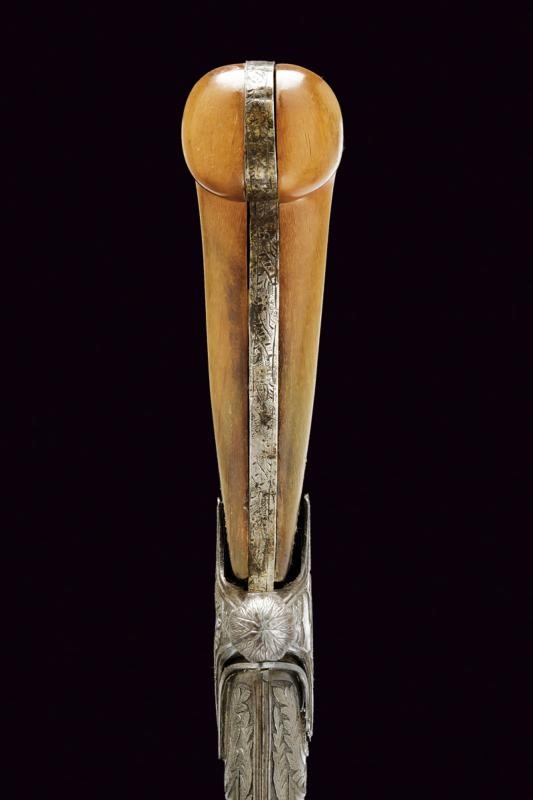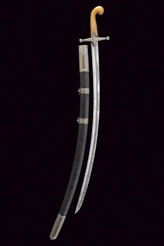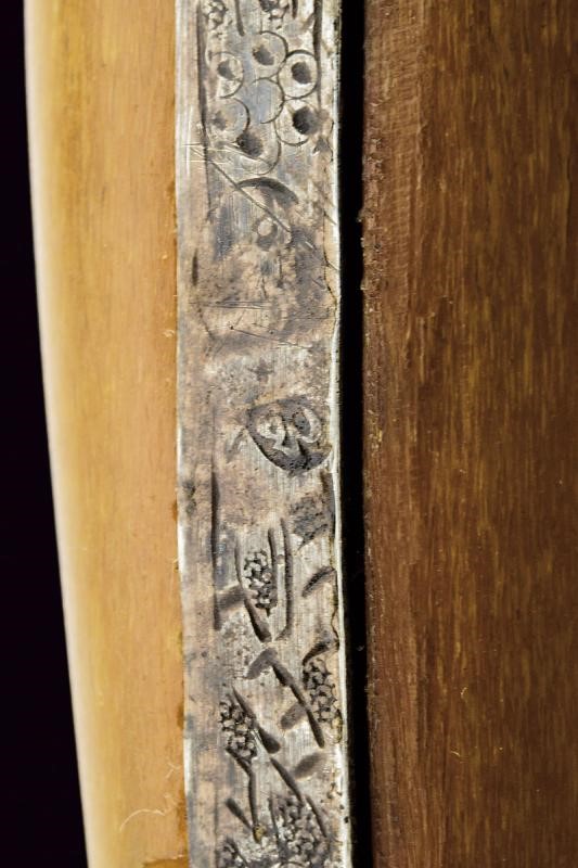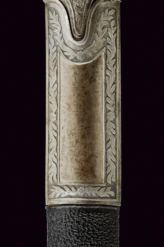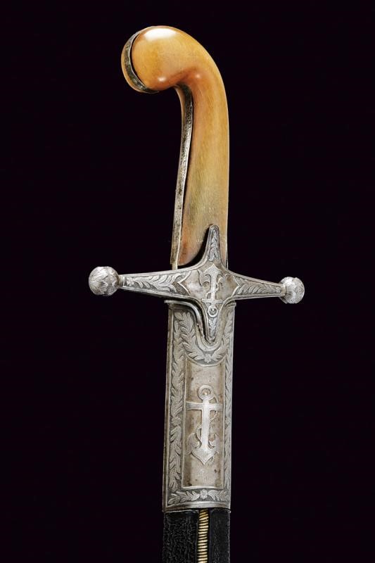Curved, single-edged, damask blade (areas with oxidation, almost easily removable), with central fuller and with dorsal groove. Damask hilt (mostly visible in the smooth parts); straight quillons ending in buds, langets decorated with floral motifs at the ends and on the right side, with a large anchor. Horn grip scales with an angled pommel, the central band decorated with floral motifs and a mark. Leather-covered wooden scabbard, typical central metal wire band; beautiful damask mounts, anchor theme and floral motifs repeated at the cap, on the bands and at the tip; interesting rope-like suspension rings; the damask is clearly visible in the smooth elements of the mounts.
