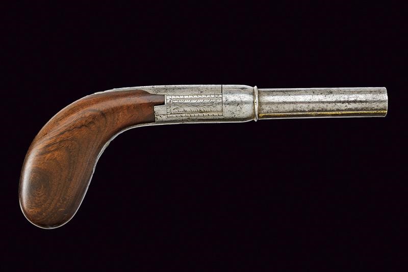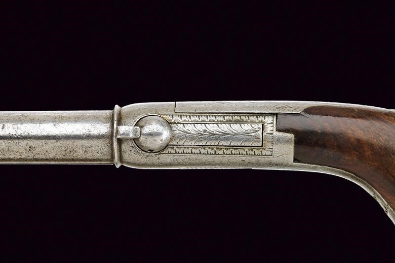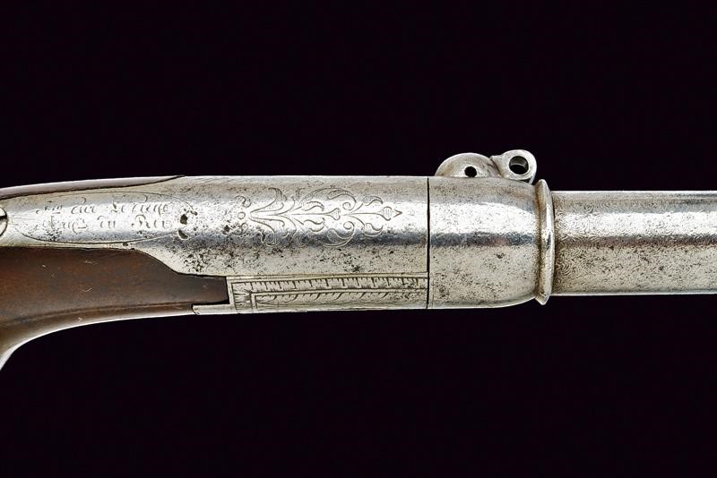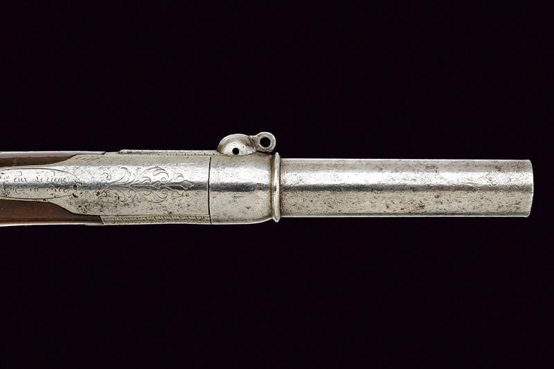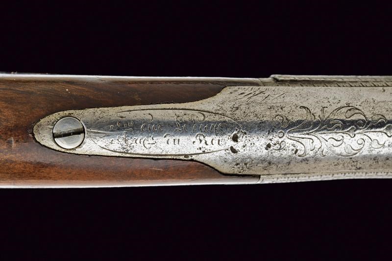 Canna tonda liscia, svitabile, in struttura di damasco, con cornice in ottone nella parte inferiore (fissaggio per una bacchetta?), cal. 10 mm; castello in ferro di sezione tonda, incisa a motivi floreali, sul lato sinistro cane decorato en suite (manca l'anello per l'armamento del cane), grilletto a scomparsa, la codetta con firma (scarsamente leggibile) "F.o Pier Le Page .... du Roi". Calcio a goccia in legno.