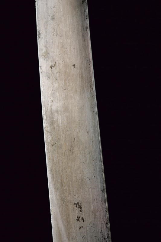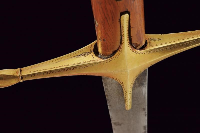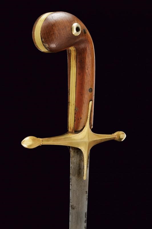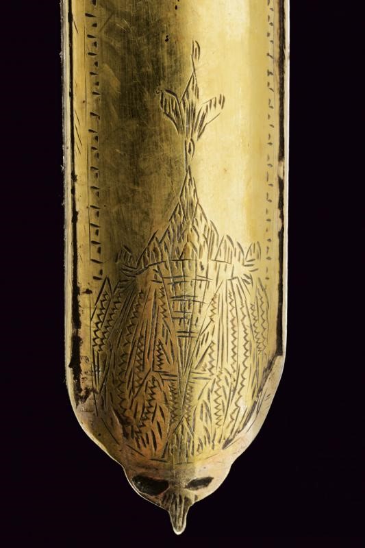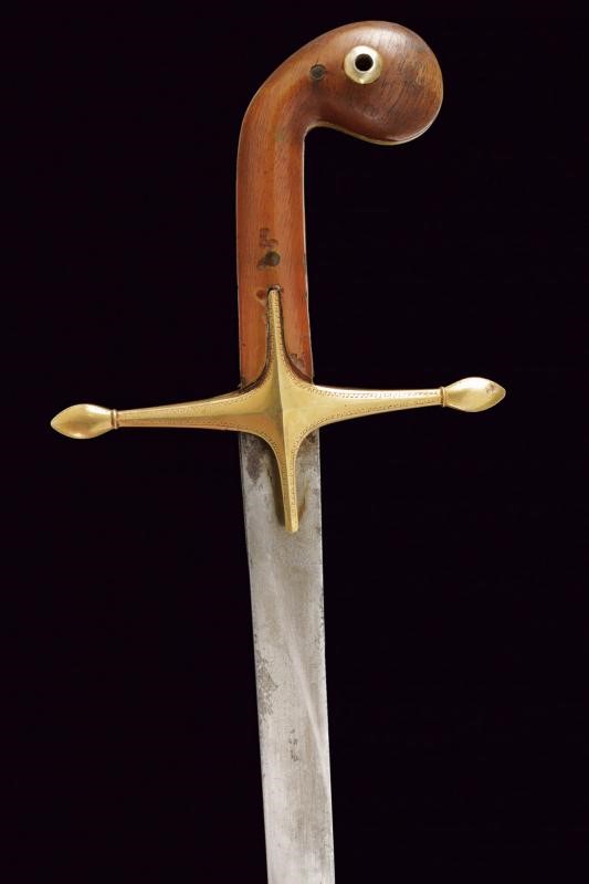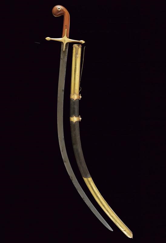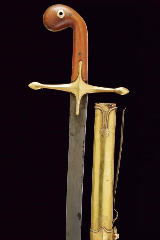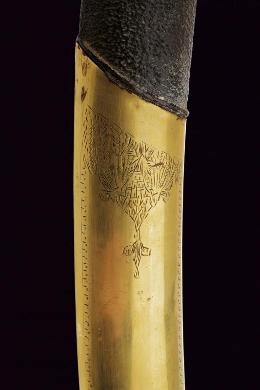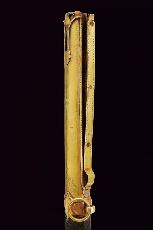 Flat, curved, single-edged blade, made of damask. Gilded metal, engraved, cross-shaped hilt, horn grip scales with wide, angled pommel. Wooden scabbard covered in leather and sewn with metal wire. Fine metal mounts made of gilded metal engraved with floral and geometric motifs. Small defects and missing parts to the cap. Two suspension rings.
