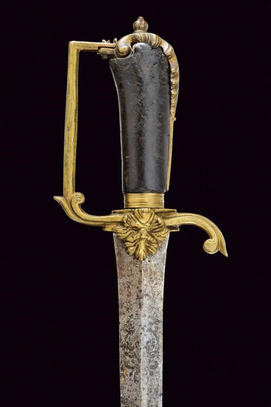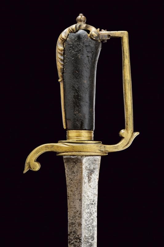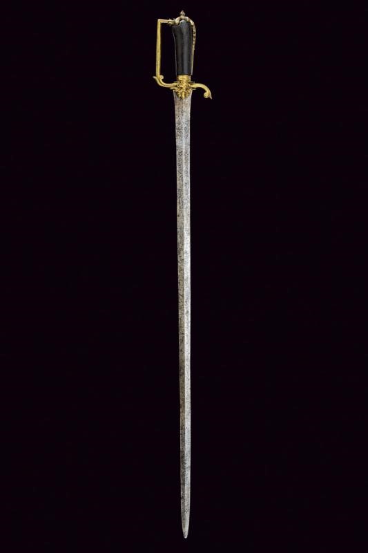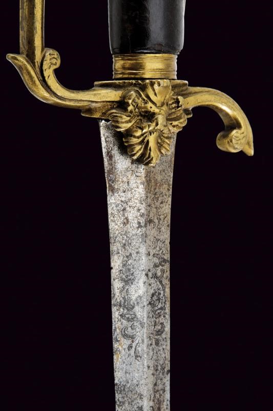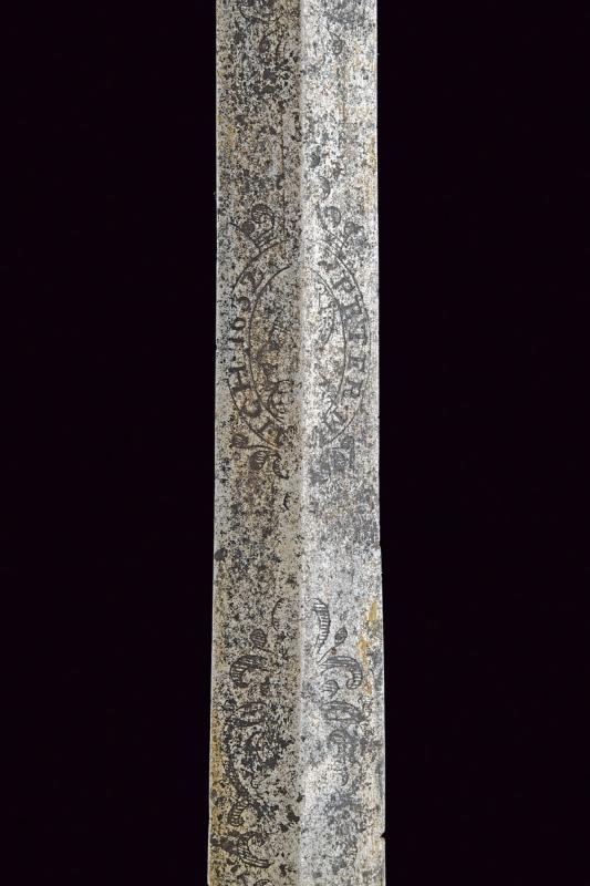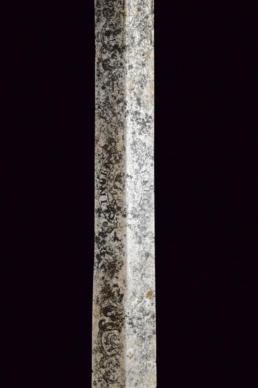 Lama dritta a due fili di sezione a losanga, con resti di incisioni floreali e marcature non del tutto leggibili alla base, sul lato di terza "PETER M..ICH 1637", sull'altro lato "SOLINGEN" e un nome illeggibile. Fornimento monoelso in bronzo decorato a fogliame in altorilievo. Impugnatura in legno rivestito di cuoio (mancanze).