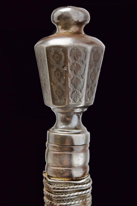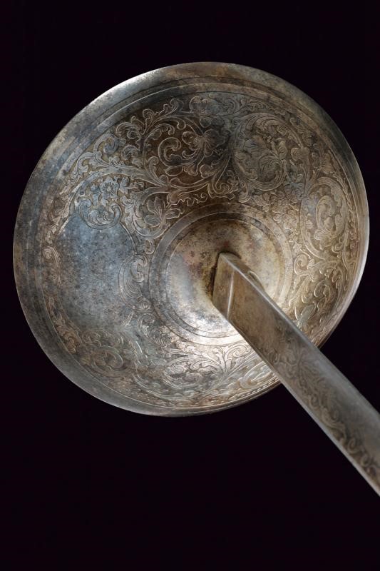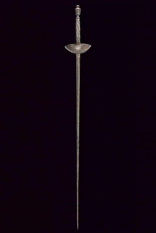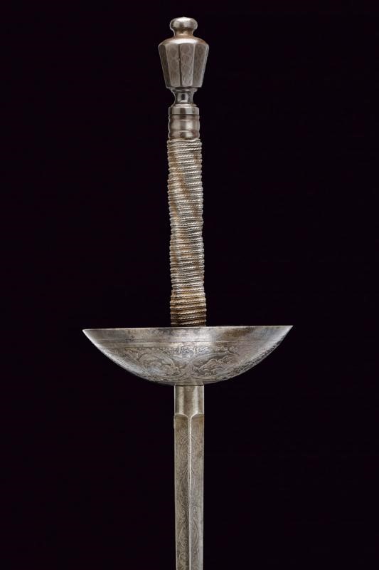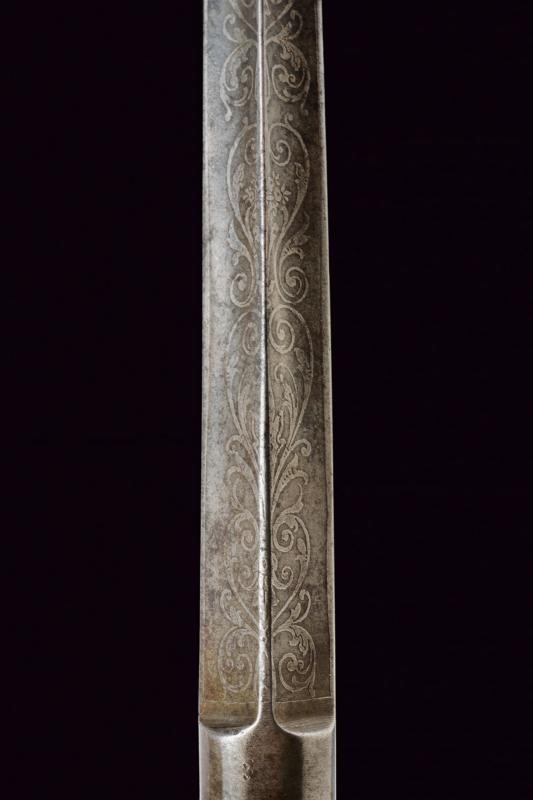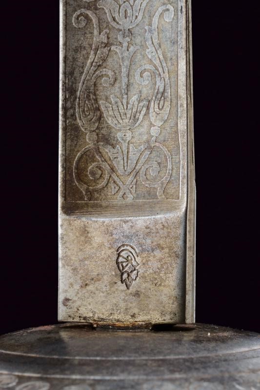 Lama dritta di sezione triangolare a facce incavate, incisa a metà lunghezza a racemi su tutte le facce. Punzone a elmo al tallone (forse Klinghental). Coccia in ferro con incisioni a racemi e un cartiglio ellittico ancora da incidere. Impugnatura di sezione quadra e tortile con avvolgimento di trecciole metalliche. Pomo a vaso inciso.