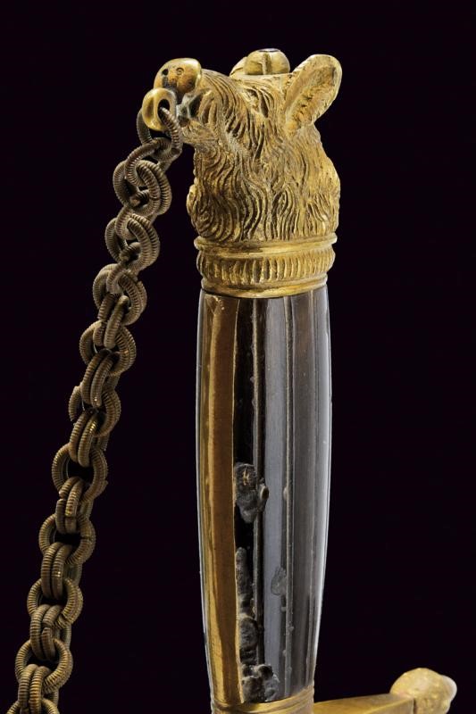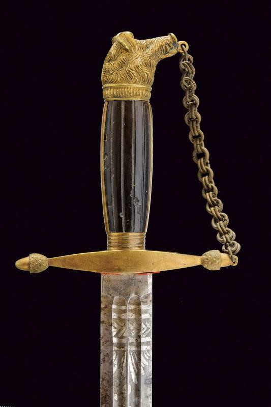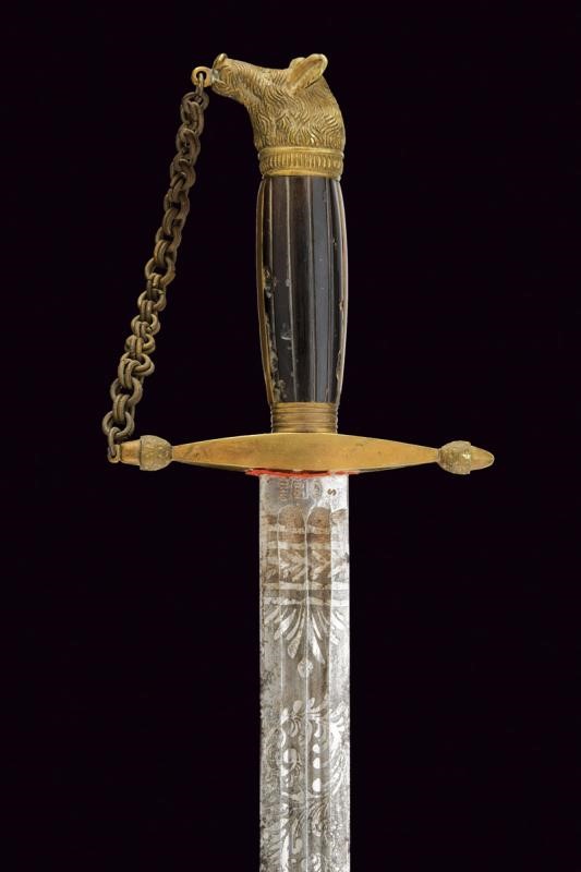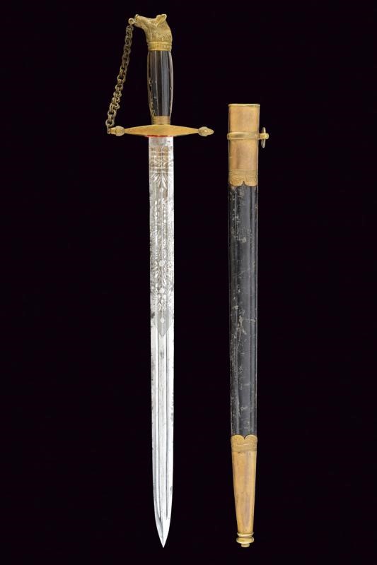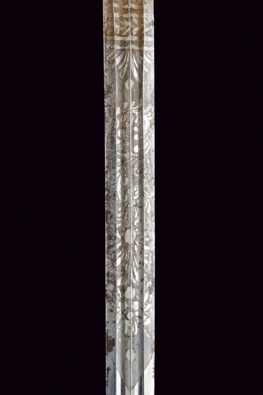 Lama dritta due fili con duplice scanalatura; incisa per metà della sua lunghezza, su entrambi i lati, a motivi floreali; tallone con punzone della real fabbrica, punzone "S" e data "1861". Elso in ottone con bracci dritti con estremità a ghianda; guardia formata da una catena costituita da coppie di anelli; pomo a testa di cinghiale. Impugnatura in corno (mancanze). Fodero in cuoio con fornimenti in ottone.