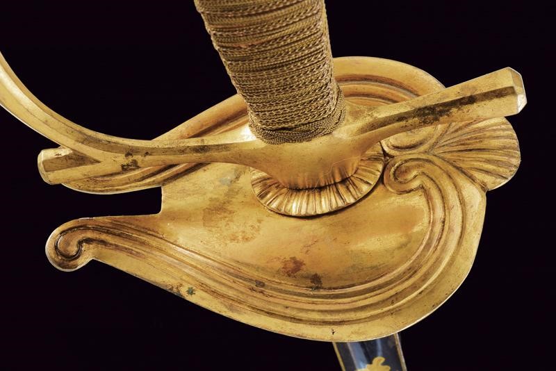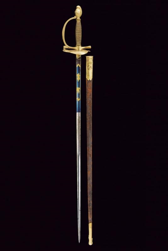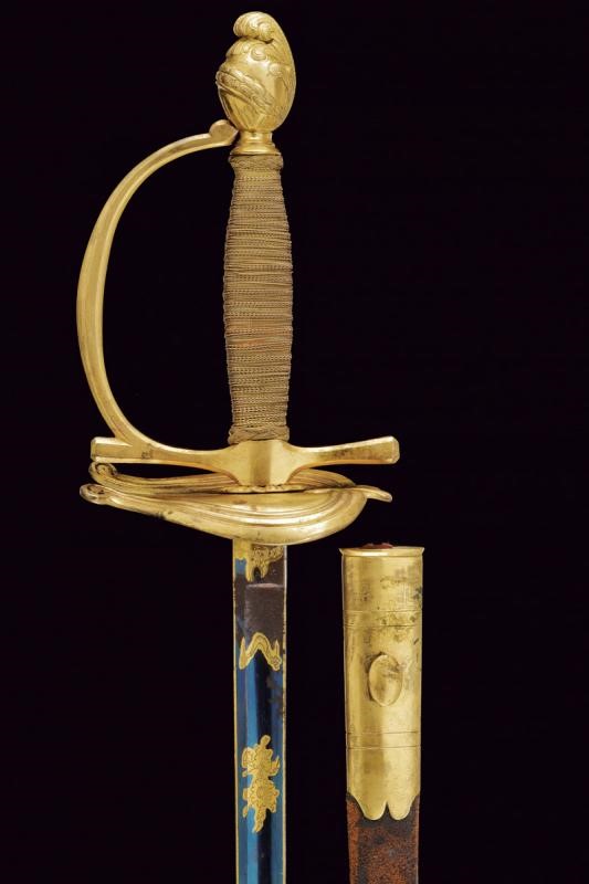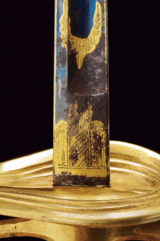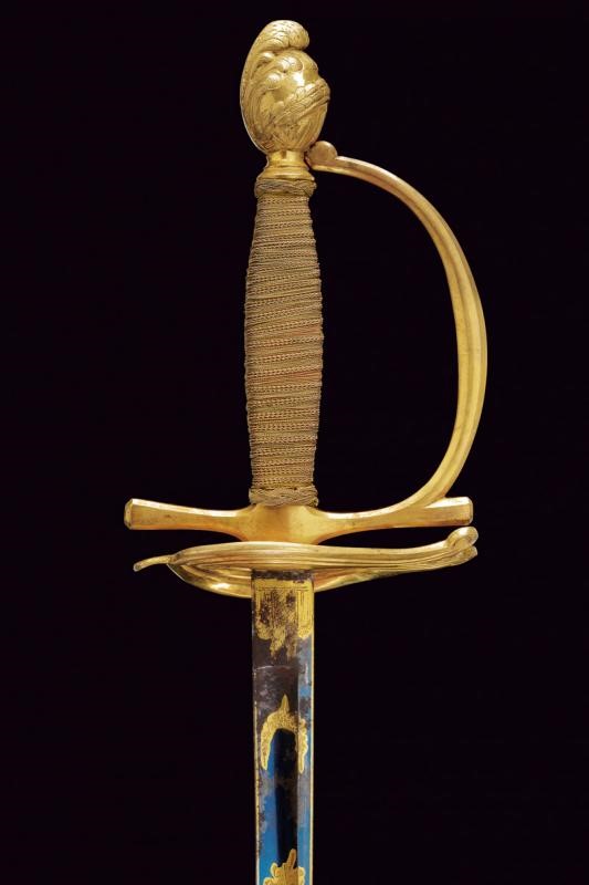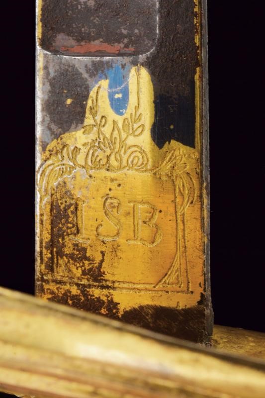 Lama dritta a un filo e controfilo sgusciato al centro, incisa e dorata su fondo blu a trofei e a motivi floreali al forte, il tallone con monogramma del fabbricante "ISB". Fornimento in bronzo dorato con coccia a cuore e pomo a elmo piumato. Impugnatura in legno rivestita con fine trecciola e dotata di teste di moro in filo metallico. Fodero in cuoio con fornimenti in bronzo dorato.