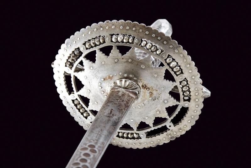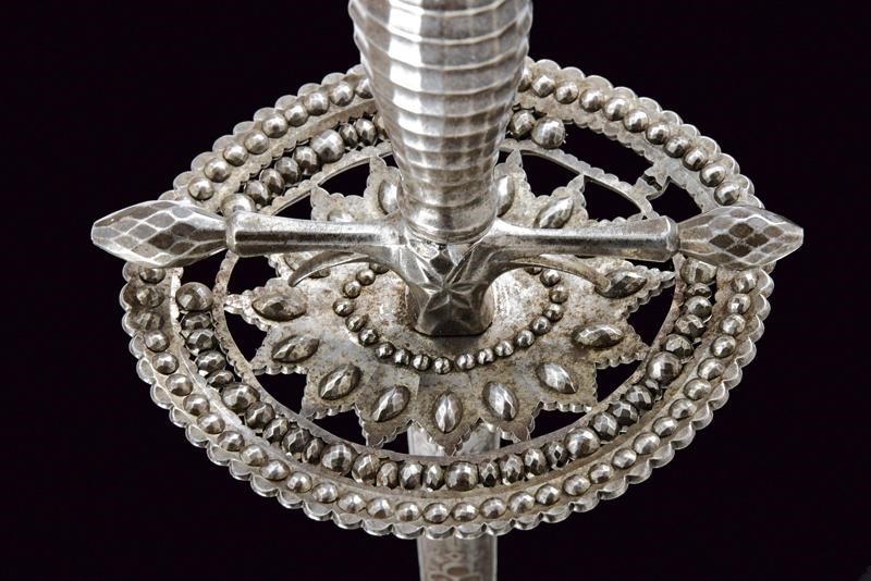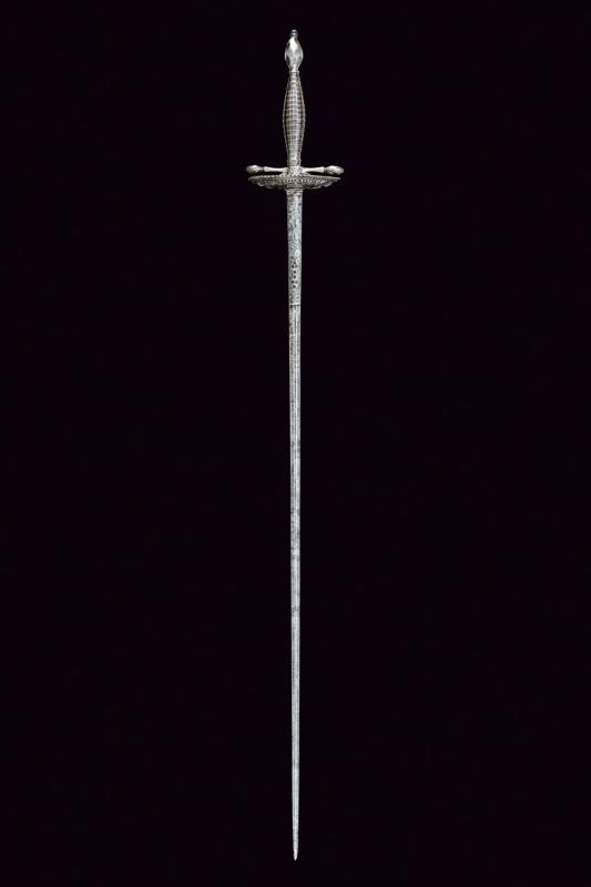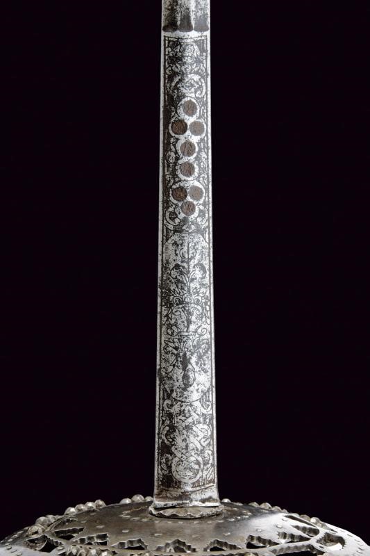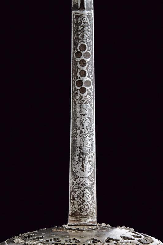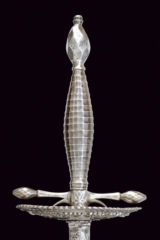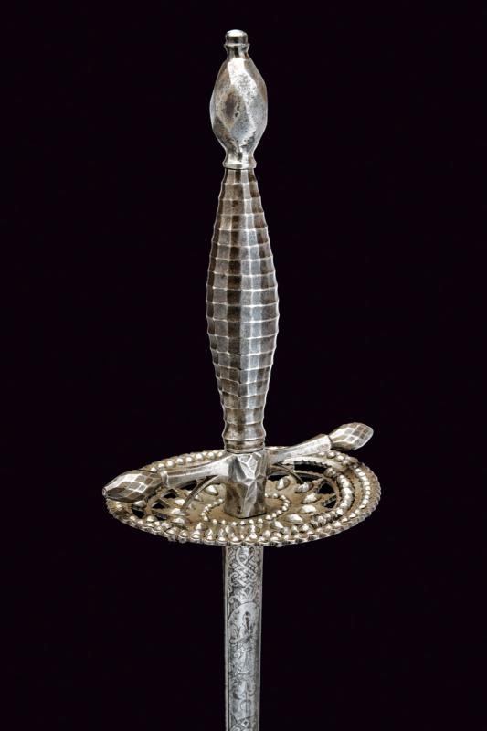 Lama dritta di sezione esagonale (intaccature, soprattutto in punta), al forte di sezione lenticolare e ornata con incisioni a motivi architettonici e floreali. Fornimento in acciaio. La coccia ellittica parzialmente traforata ornata con decoro diamantato soprattutto sul lato concavo. Elso intagliato a riprendere lo stesso decoro, cosi come il pomo. L'impugnatura lavorata a sgusci a formare un reticolo. Fodero mancante.