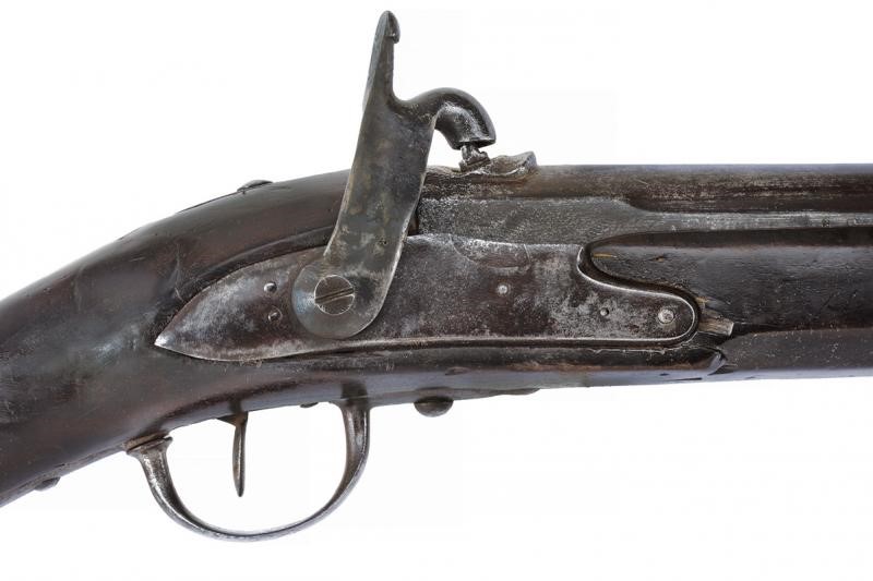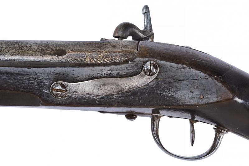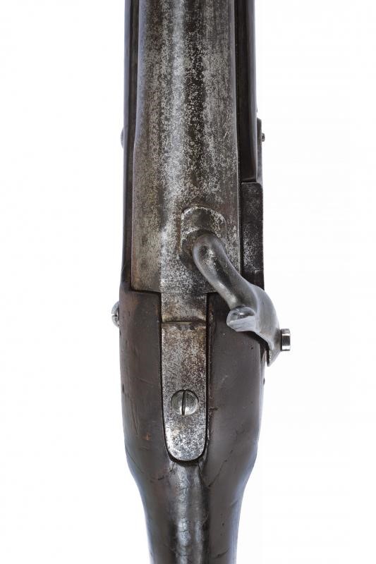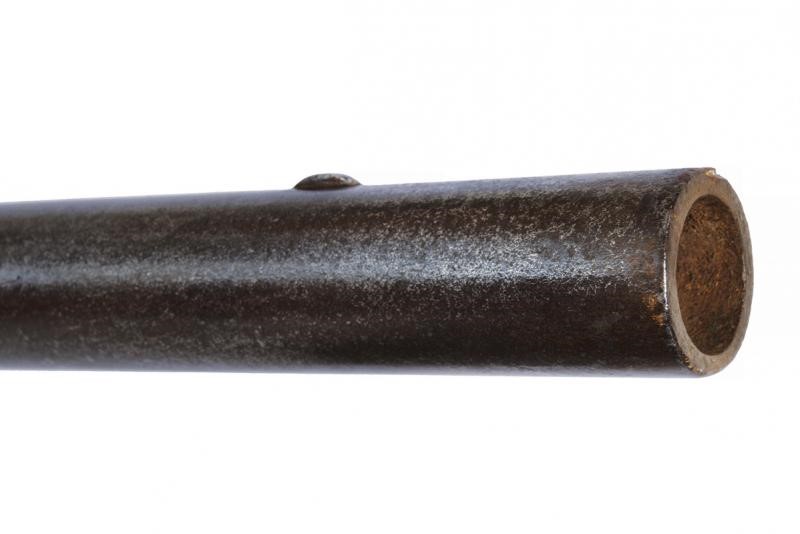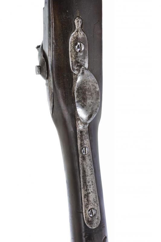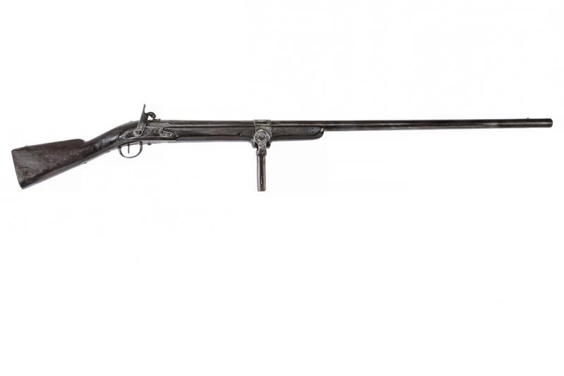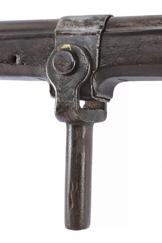 Pesante e lunga canna liscia, dotata di mirino, in volata cal. 27,8 mm. In culatta l'alzo fisso. Batteria militare ridotta a luminello. Mezza cassa in legno con segni d'uso e del tempo. Fornimenti in ferro. Munito della sua forcella antica per il montaggio su spalto. Raro.