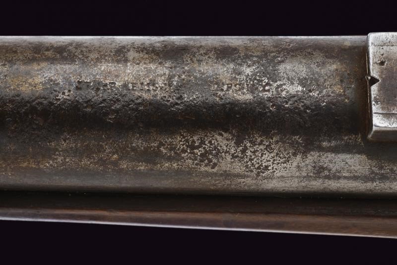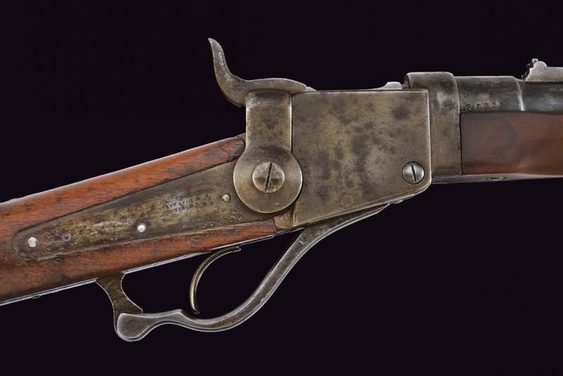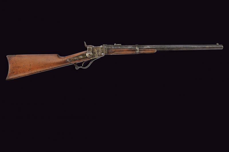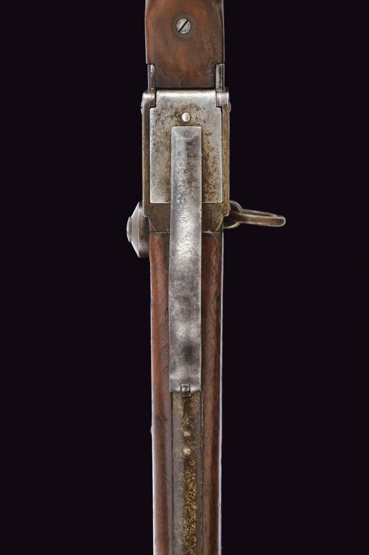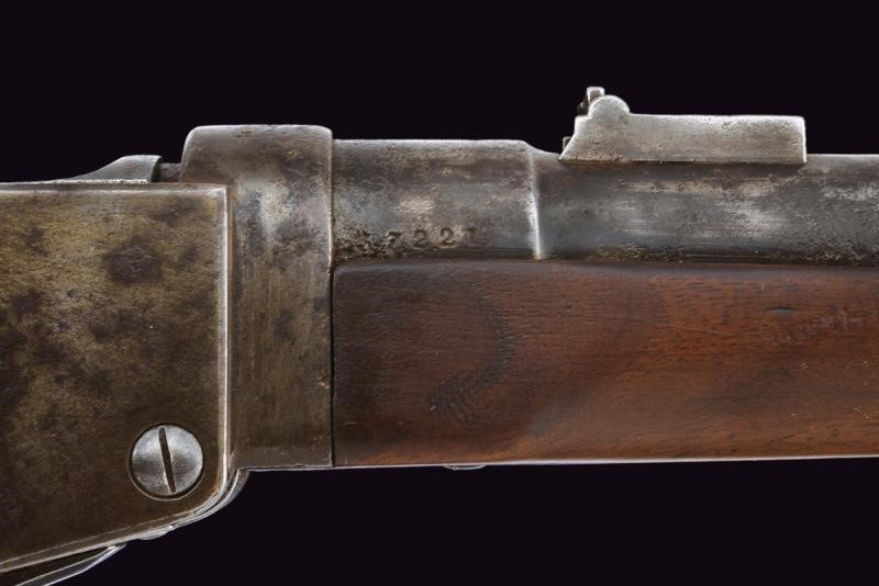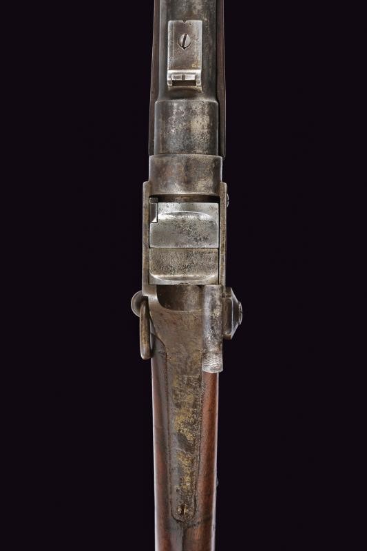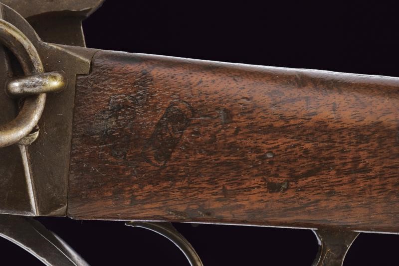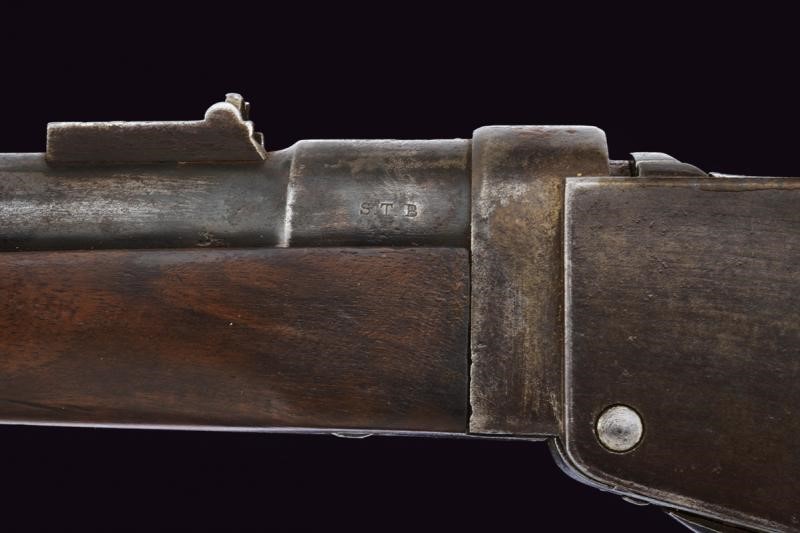 Canna tonda rigata da 21", dotata di mirino e alzo, cal. 54. Rigatura visibile, incrostazioni. Resti di marcatura "STARR ....." al dorso e marcatura "S.T.B."; numero di matricola "377xx"" sul fianco. Castello a blocco cadente con ponticello che funge da leva d'apertura. Il codolo dorsale con forti danni da ruggine. Batteria con marcatura "STARR SRMS C.O YOHRKERS N.Y". Meccanica a retrocarica a luminello. Funzionante. Calcio ed astina lisci, in noce, il primo con resti di due timbri militari. Anello da sella. Danni da ruggine e incrostazioni sulle parti in ferro.