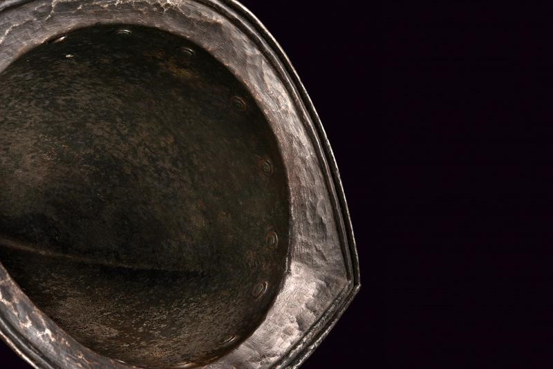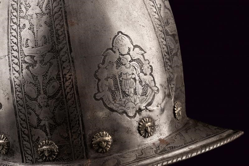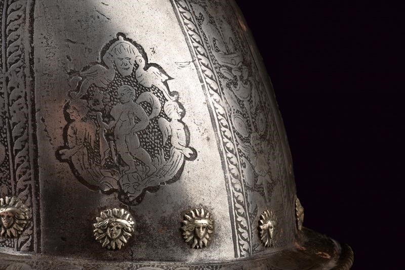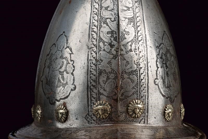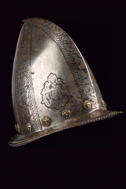 Coppo in ferro lavorato in un solo pezzo, costolato in mezzeria, con apice rivolto all'indietro; tesa leggermente spiovente, appuntita e costolata, il margine ribassato e con bordo lavorato a fingere il tortiglione. La superficie incisa a bande e cartigli, recanti personaggi, armi, vasi, animali grotteschi e decori floreali su fondo scuro e granulato. La base con giro di ribattini in ottone decorati con volti su raggi. Piccolissimi danni. L'interno con belle tracce delle martellature.