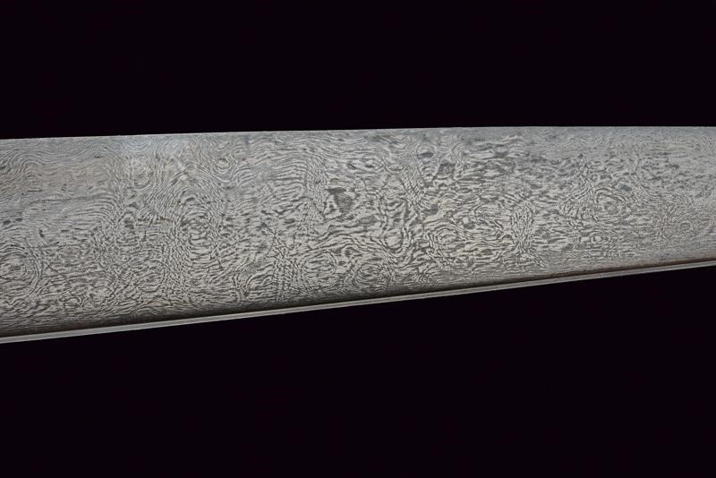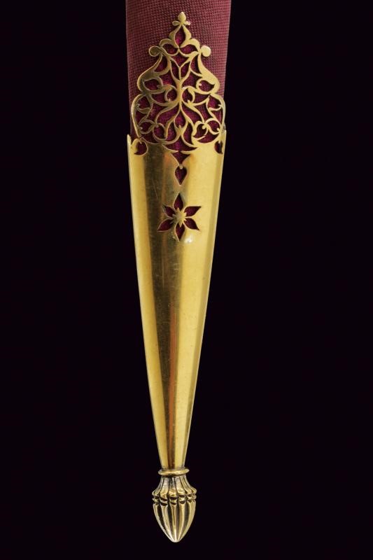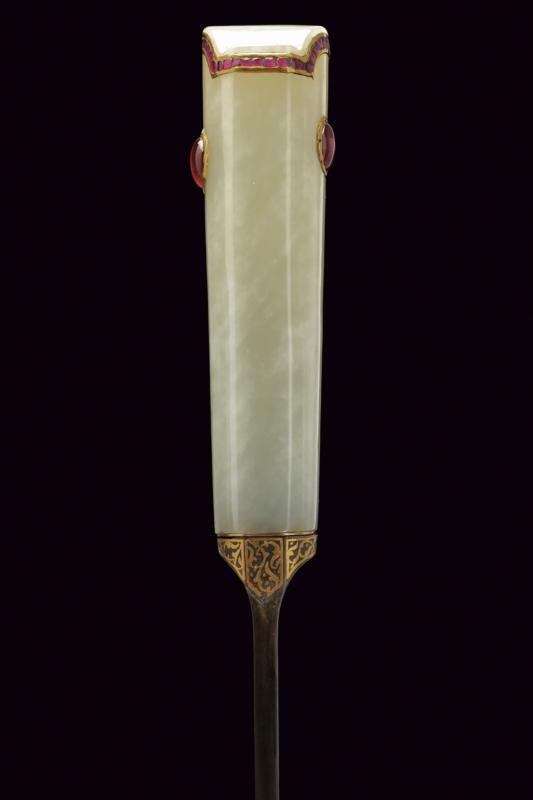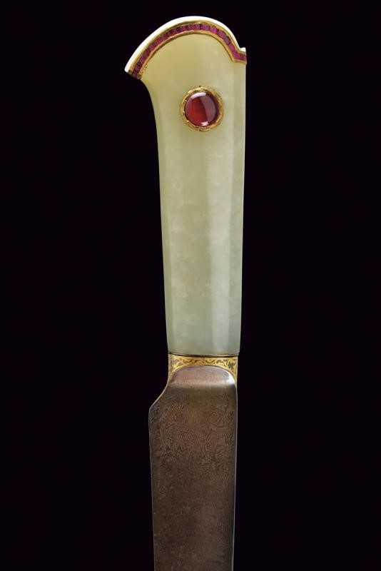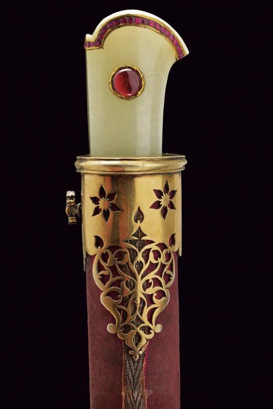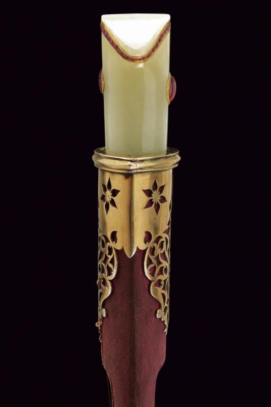 Straight, single-edged blade of fine Wootz damask, worked in one piece with the tang decorated with gold floral motifs. Pale green jade grip with stylised beak-shaped pommel decorated with a row of rubies on the border, in the centre a cabochon eye, all framed in gold (kundan technique). Wooden scabbard covered in red velvet (completely lined under the mounts) with bullion band. Elegant vermeil mounts, finely pierced with floral motifs. Suspension ring.