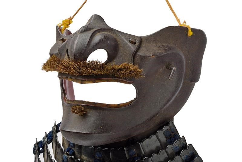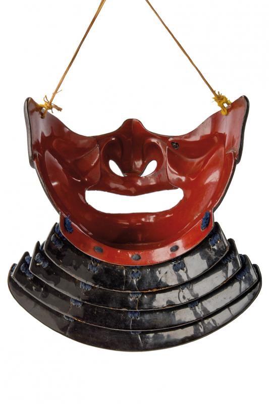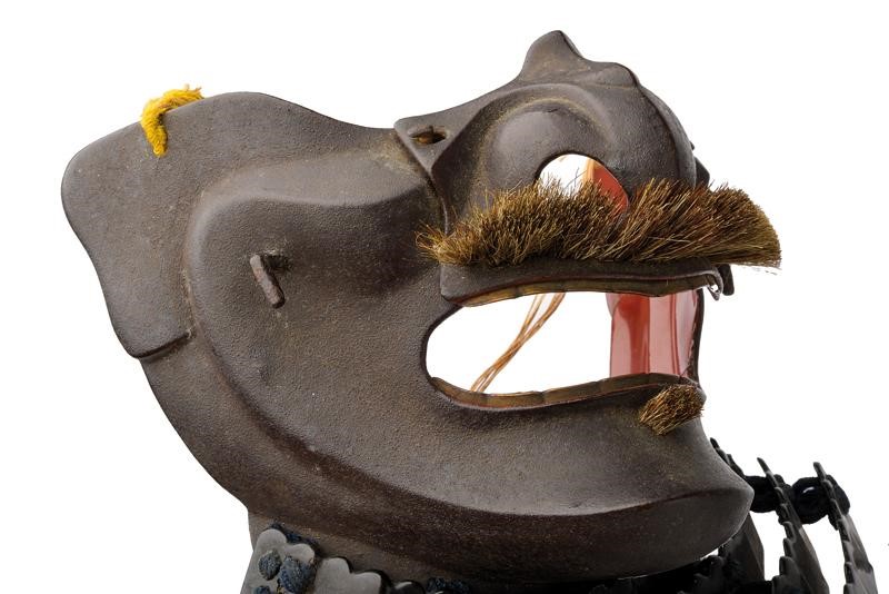 Me-no-shita-men type. Made of iron covered in beautiful Sabinuri lacquer (rusty finishing). Complete with removable nose and horsehair mustachios. Orikugi on the sides. Open mouth adorned with gilt teeth. Inside in red lacquer. Finishing with minor missing parts. Yodare-kake with three plates in shiny brown lacquer.