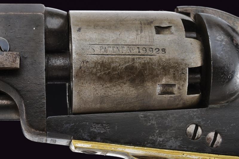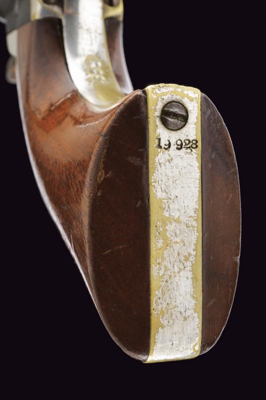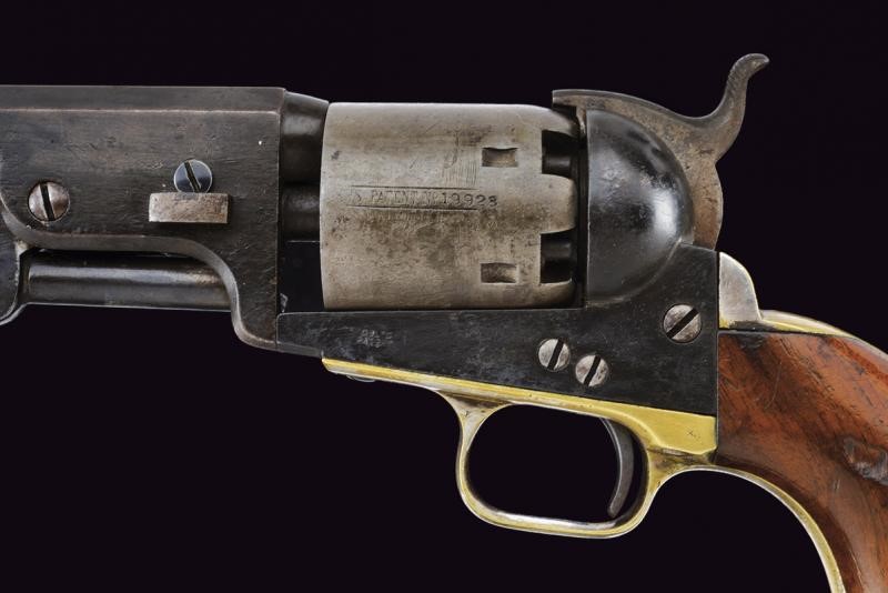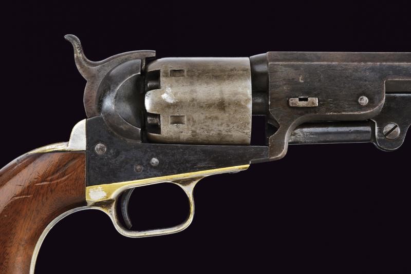 Third Model. Octagonal, rifled, 36 cal barrel with brass front sight, marked ‘ADDRESS COL. COLT NEW YORK CITY’. Smooth six-shot cylinder. Working mechanism. Frame marked ‘COLTS PATENT’. Serial number ‘19xxx’ matching on cylinder, barrel, frame and grip frame. Trigger guard and frame in 60% silver-plated brass. Browned barrel and frame. Wooden grip.