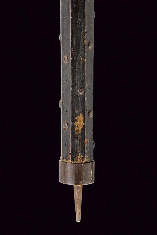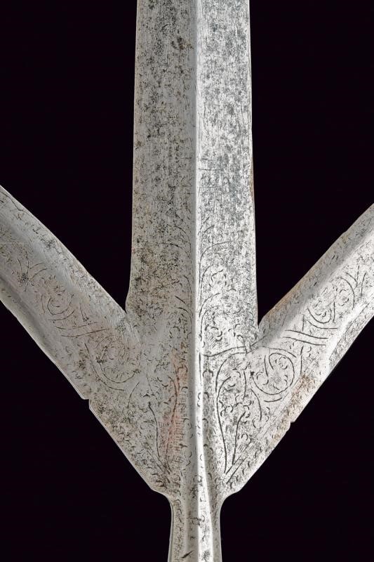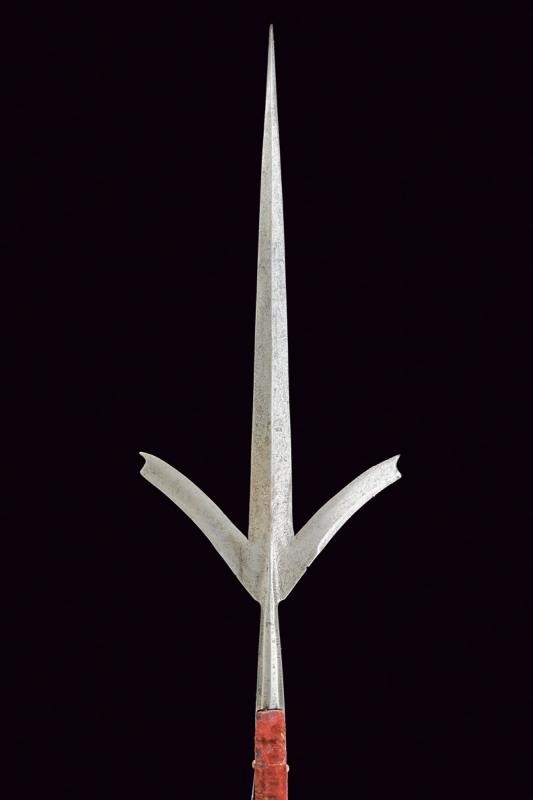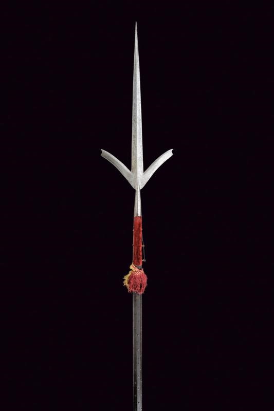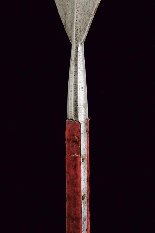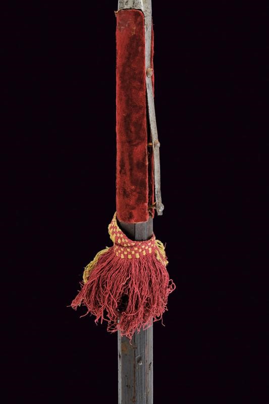 Blade-cusp, ribbed in the middle and slightly thickened at the tip to form a small square. At the blade base, as in the initial segment of the wings, there are visible remains of engraved racemes and intertwined bands. The wings are double-edged, almost straight with barely visible claws. Ferrule shaped as a truncated cone. Medium-length straps (one partially detached from the wood) with claws provided with stud-shaped head. The shaft of not recent production (19th century?) covered in the upper segment with a red velvet and an old red and green fringed tassel. Woodworm holes. The shaft is provided with pegs. Iron shoe with a pointed tip.