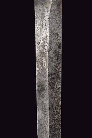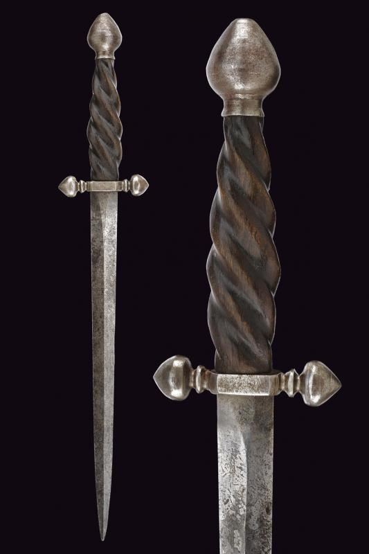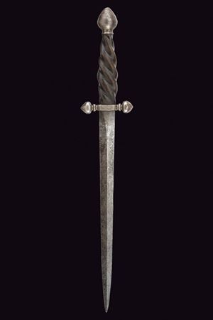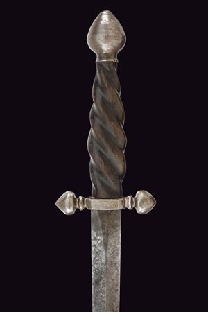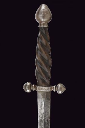 Straight, double-edged blade, ribbed in the middle, short tang. Iron hilt with short quillons, with strawberry-shaped ends, as is the pommel. Carved wooden grip with coils.