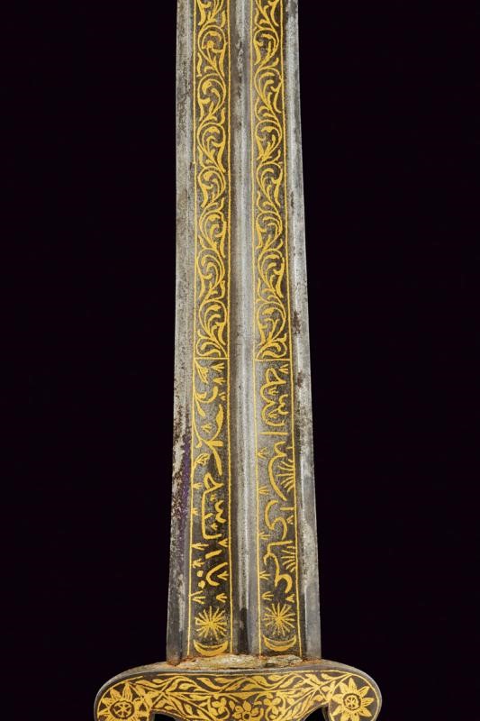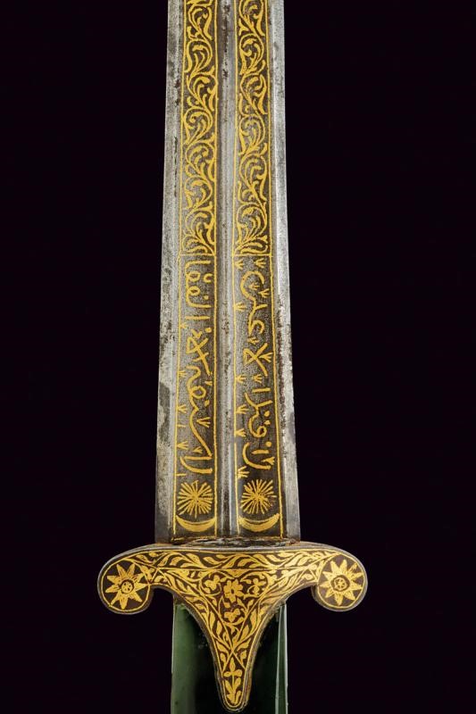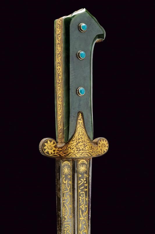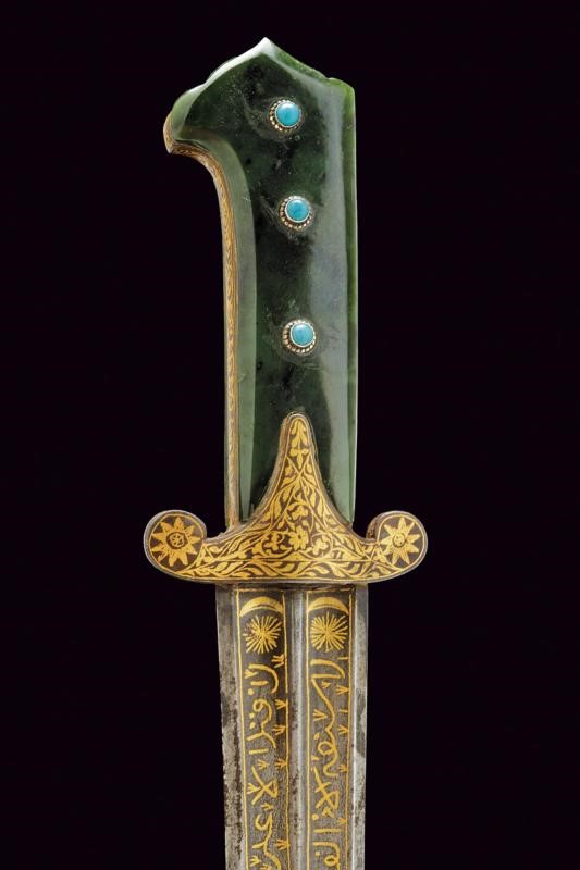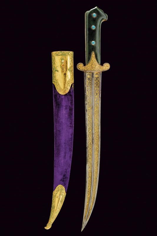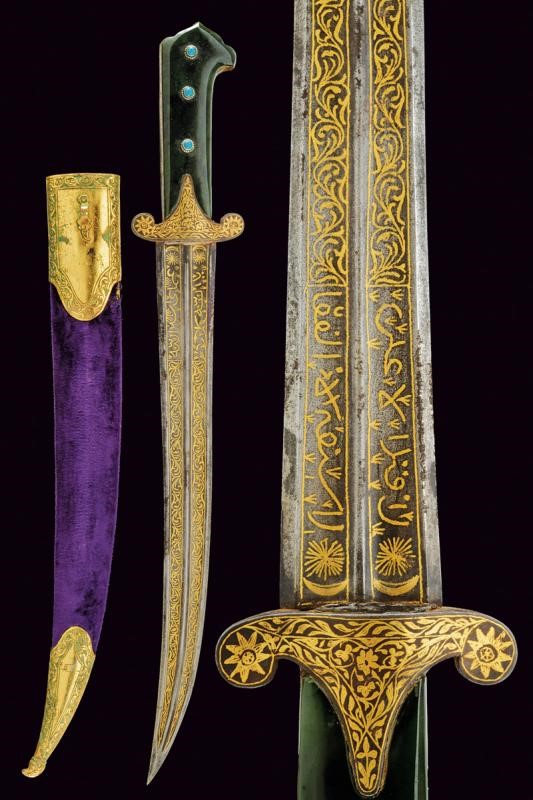 Curved blade ribbed at the centre and with two deep full-length grooves,odf lozenge section at the tip. Inside the grooves are gold koftgari inlays with bands of racemes, in the first segment four cartouches (two on each side) with inscriptions in Arabic characters (all different). A double star and crescent on both sides of the base. Iron hilt with short lobed quillons, finely gold inlaid and with racemes, flowers at the centre and on the lobes. Green stone (jade-like) grips with a beaked upper end and a summit cusp. Short crack on one side. On both sides, three blue cabochons similar to turquoise. Wooden scabbard covered in purple velvet (later?) with bronze mounts featuring traces of gilding, decorated in relief with raceme frames. On the back, a small loop.
