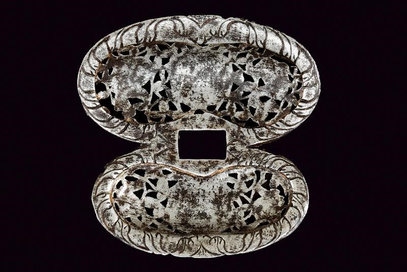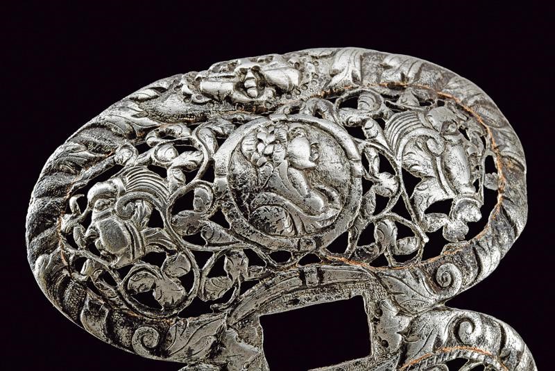Made of iron, with a double fretwork valve; the front one slightly larger, with a rectangular hole in the centre; the outer surface with fine carvings in bas-relief depicting floral motifs, masks and in the centre of each valve a bust in bas-relief within a circular medallion; the inner border with spirals carvings. Of good quality.