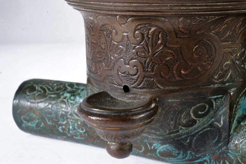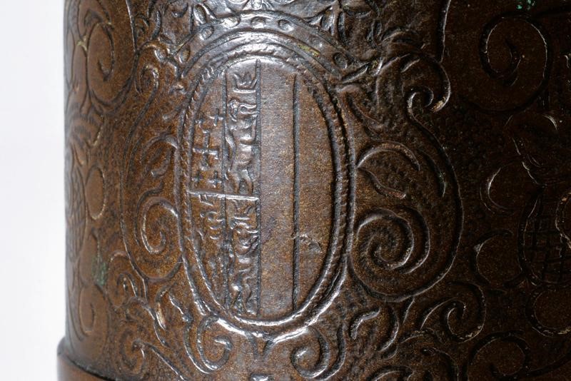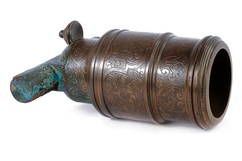 Bronze structure with cylindrical shape, with a larger section in the first segment, a long neck at the breech, and moulded muzzle at the nozzle. At the base there is a pan placed perpendicular to the shaft. On the bottom there are two cylindrical trunnions. The entire surface is engraved with flowers and frames. Featuring a crowned heraldic emblem on the back.