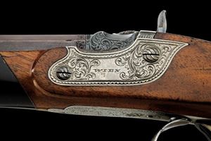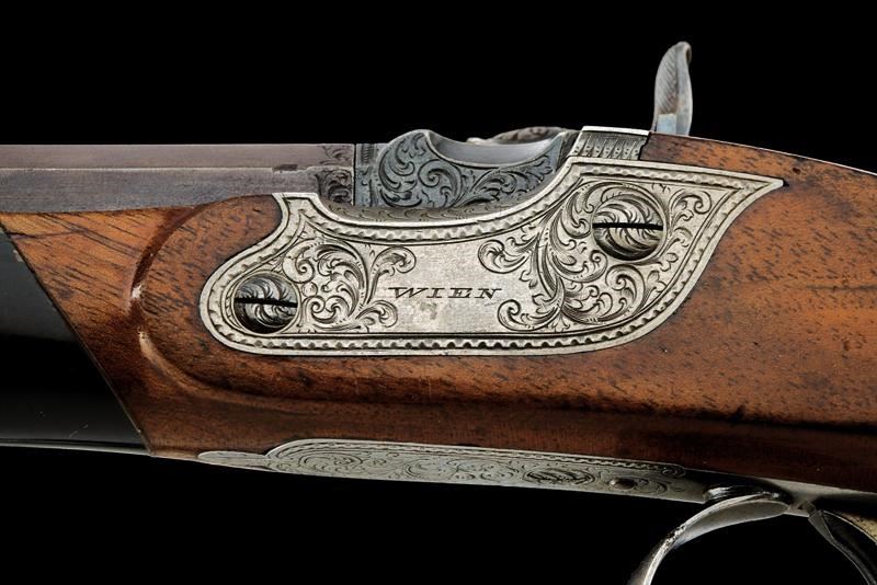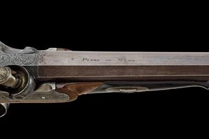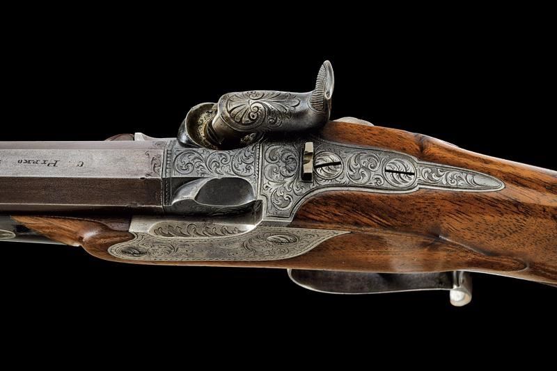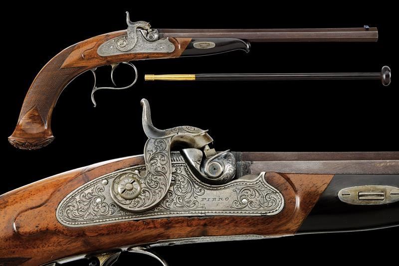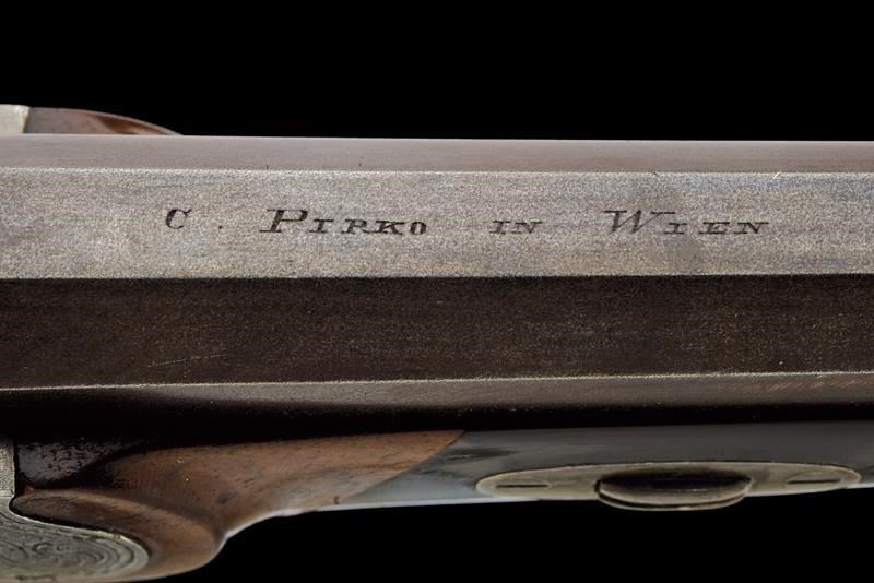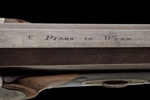 Rifled, browned, 7,2 mm cal. barrel of octagonal section (clean bore, viisible rifling), the base with spiral decorations, a little further the signature "C. PIRKO IN WIEN", precision foresight at the nozzle. Tang engraved en suite at the base and provided with adjstable rear sight via screw. Percussion forward spring lock, the lock plate with outlined borders featuring the signature "PIRKO", its surface like that of the cock totally encircled with racemes and spirals; percussion with spark arrester. Wooden, half stock with horn front side, checkered butt and carved butt-plate with beautiful mask enlarged towards the hand for a better grip. Iron mounts engraved en suite, the counterplate marked "IN WIEN". Complete with ramrod, inserted inside the barrel, made of wood with donut-shaped base and brass and iron turn-off cartridge extractors.