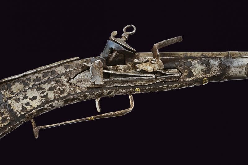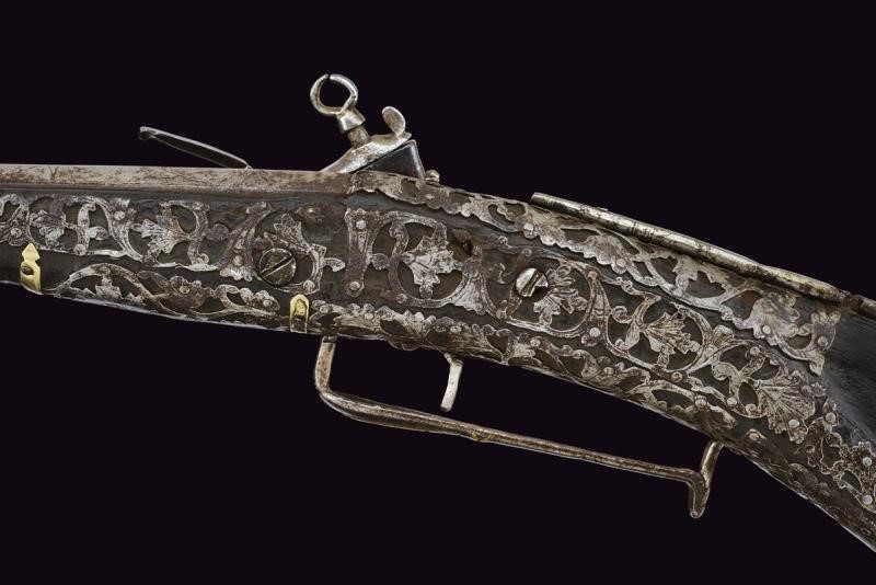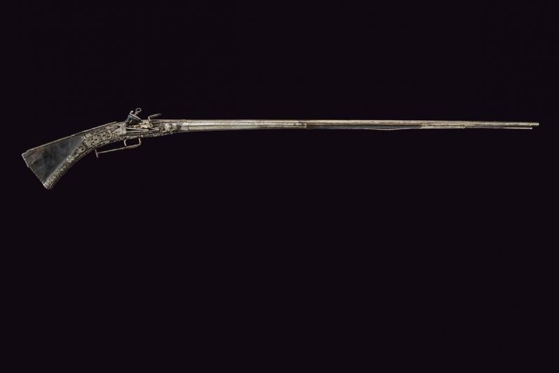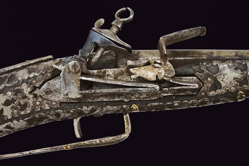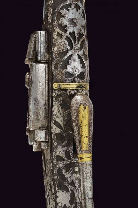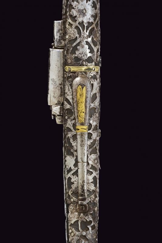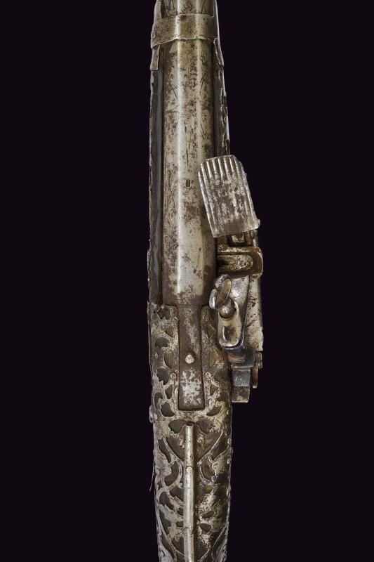 Long, smoothbore, 10.5 mm cal barrel of octagonal section with round nozzle, the base with remains of engraving. Miquelet flintlock. Wooden stock (small missing parts and restoration to the butt) partially covered with iron plates, those on the butt richly engraved and pierced with floral motifs, small missing parts. Iron trigger guard with brass decorations. Iron ramrod with knotted end.