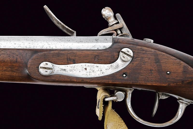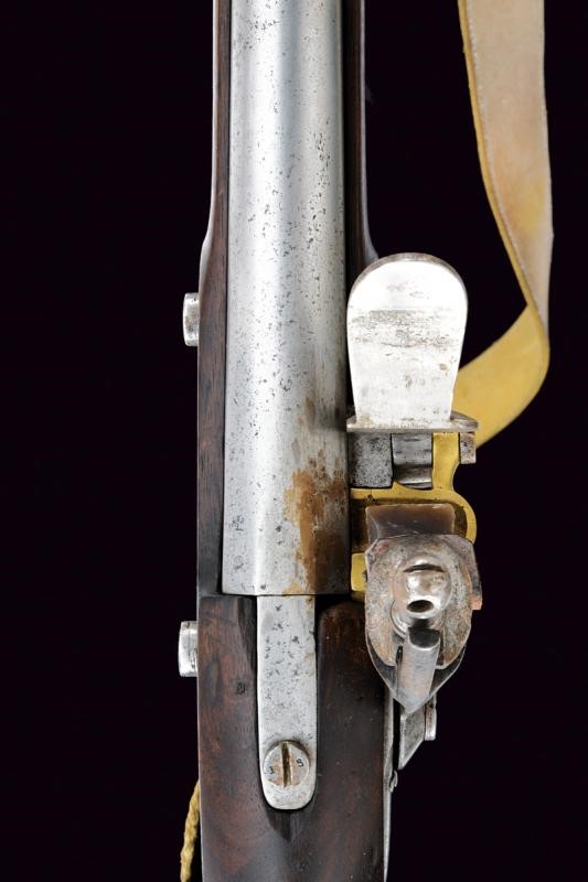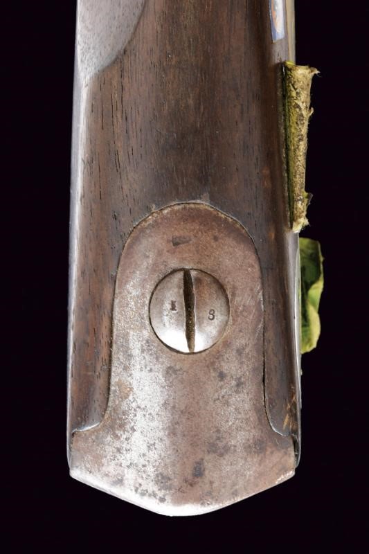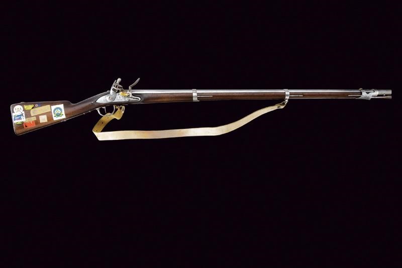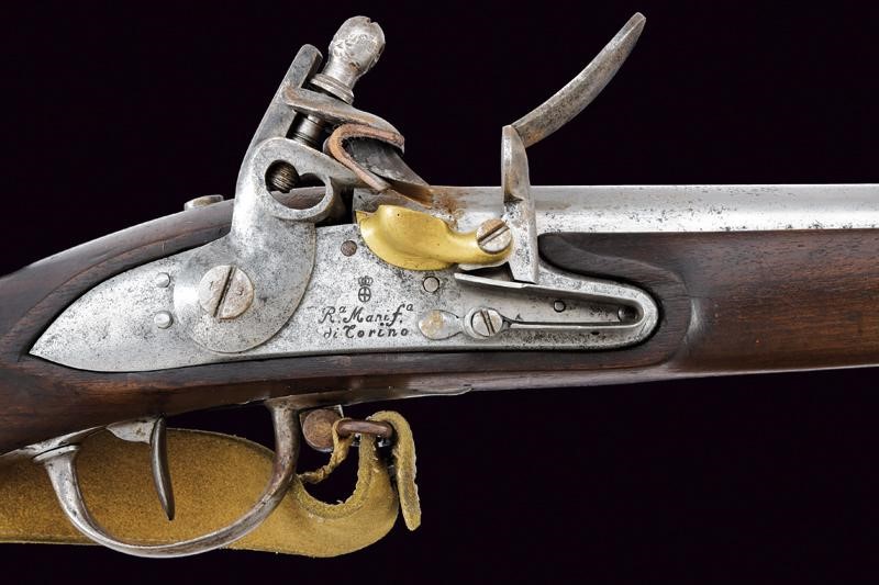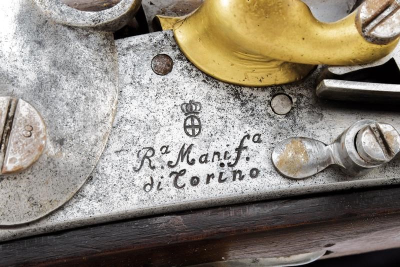 Round, smoothbore, 18 mm cal. barrel octagonal at the base, clutch for the bayonet, with not clearly visible markings at the base; smooth tang; flintlock signed "R.a Manif.a di Torino" and with Piedmontese mark. Wooden full stock with iron mounts with marks. Iron ramrod. On the right side, labels indicating participation in world and European championships. White leather strap.
