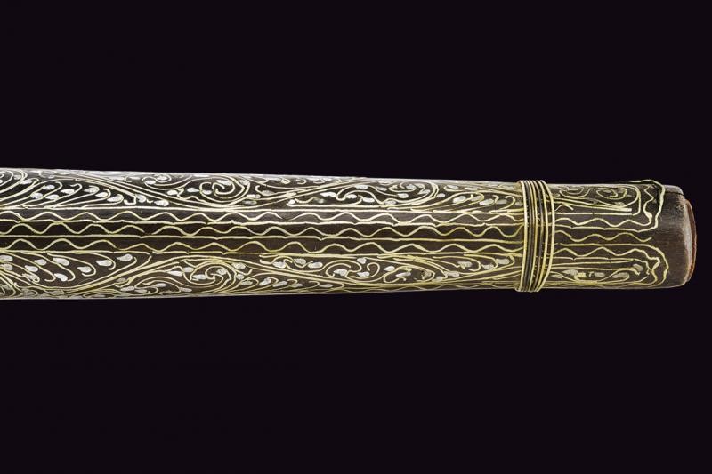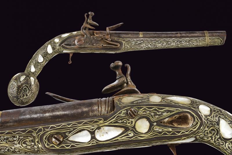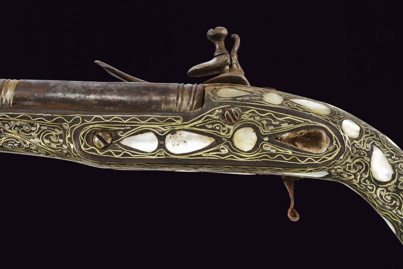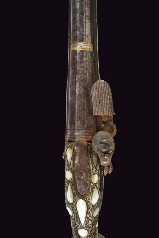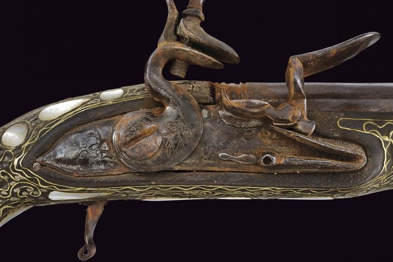 Smoothbore, two-stage, 14.4 mm cal. barrel of round in section and divided by grooved rings, with rib. Flintlock with rounded lock plate, engraved tang and hammer throw. Wooden full stock with spherical pommel, completely decorated with mother-of-pearl plates (some missing parts) and filigree silver and brass decorations.
