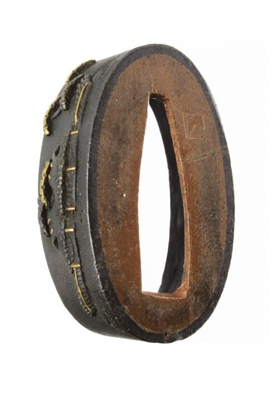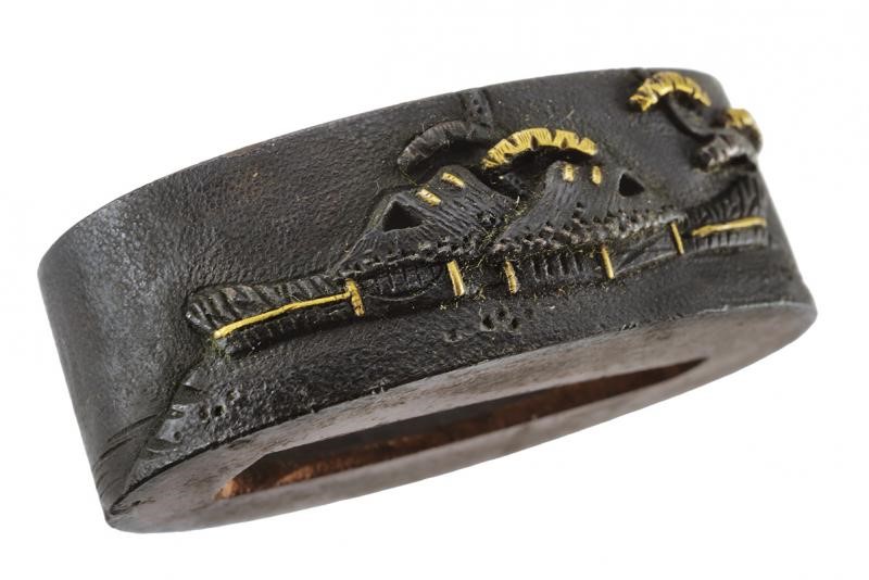 Of blackened and partially gilded shakudo depicting trees in bas-relief. In a kiri box.