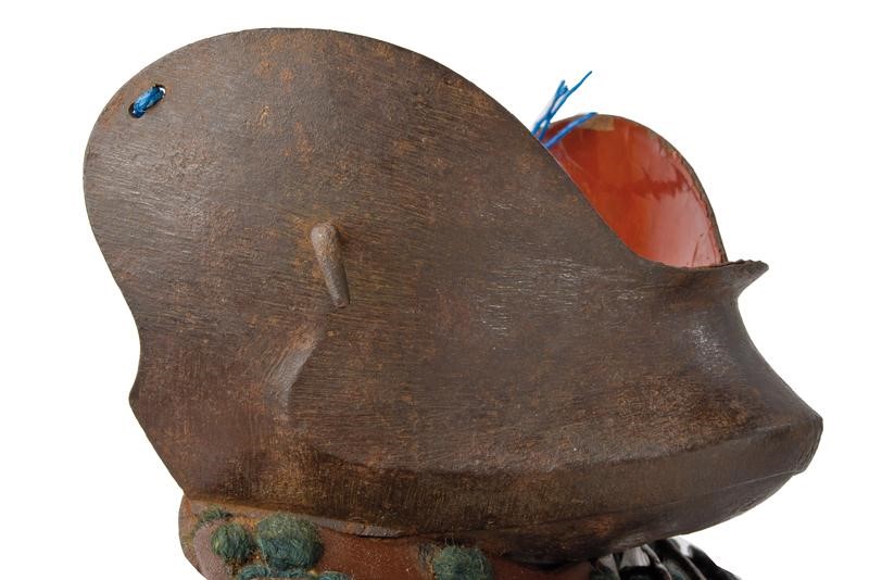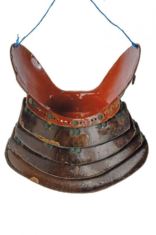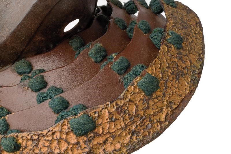 Made of iron, with non-lacquered outer surface, with Orikugi. The inside made of glossy red lacquer, with some missing parts at the borders. Yodare-kake with four iron blades with wavy borders, three in red lacquer and one in gilded lacquer (missing parts at the finishing). Lacing in green Sugake style. All the blades with back side in brown lacquer. Unusual.