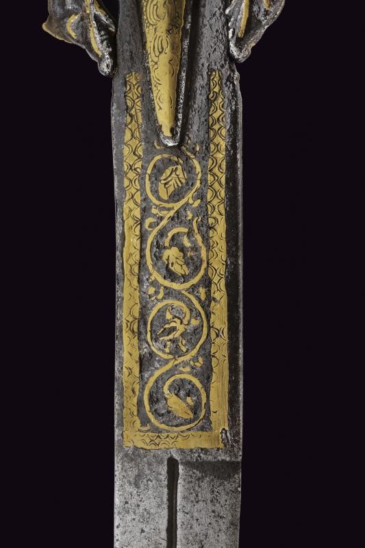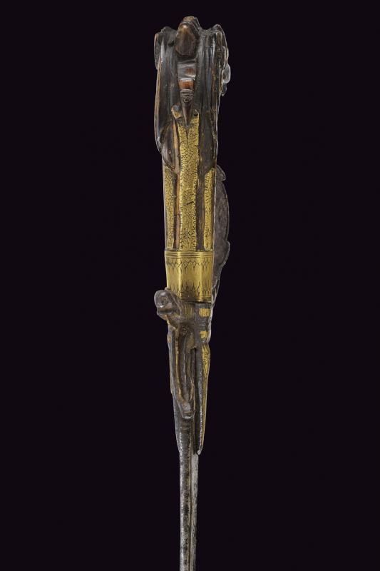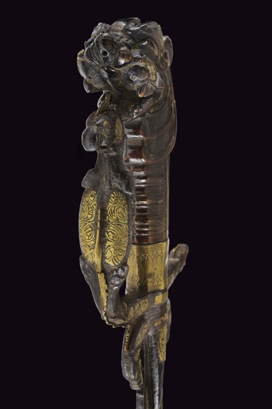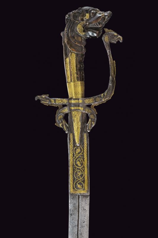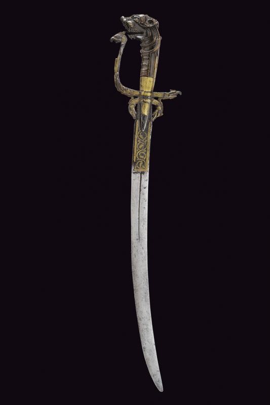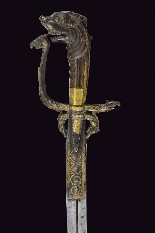 Curved, single-edged blade, the base with central fuller, long tang decorated with brass and engraved with floral motifs within a frame. Iron hilt with long, triangular wings; arches, quillons and loop-guard ending in a dragon's head, all partly made of brass. Horn grip (breakage) carved as a dragon's head. Missing parts and defects.