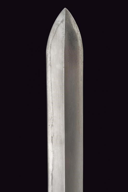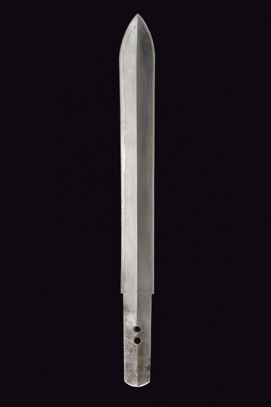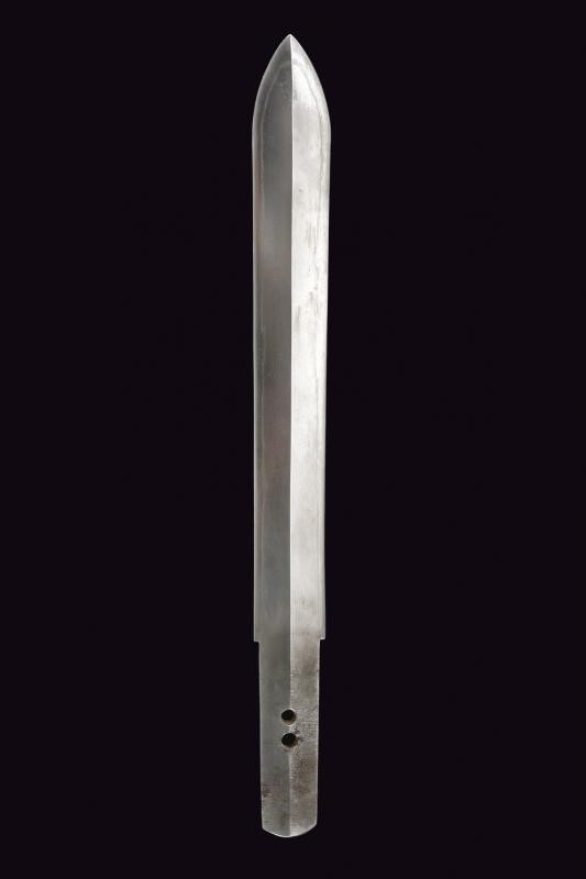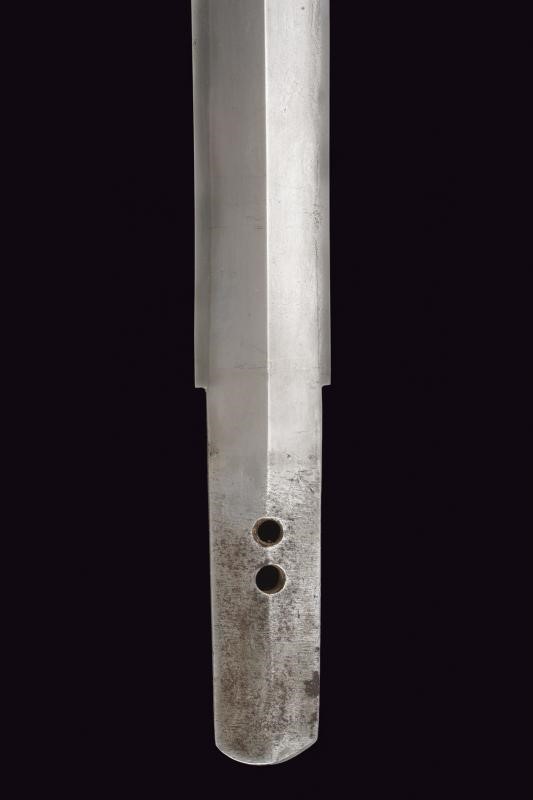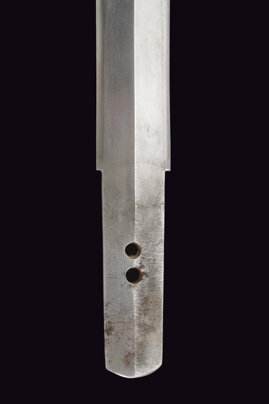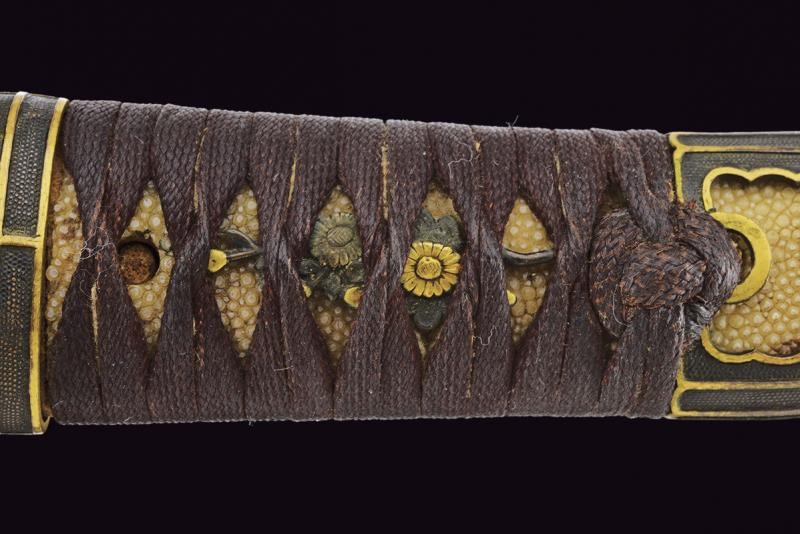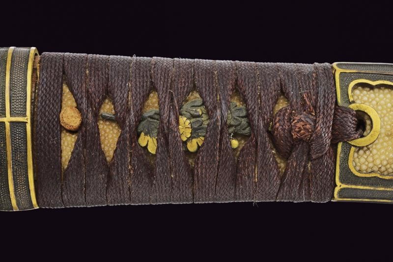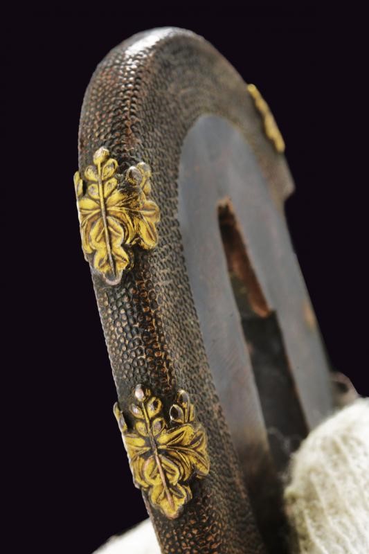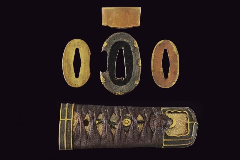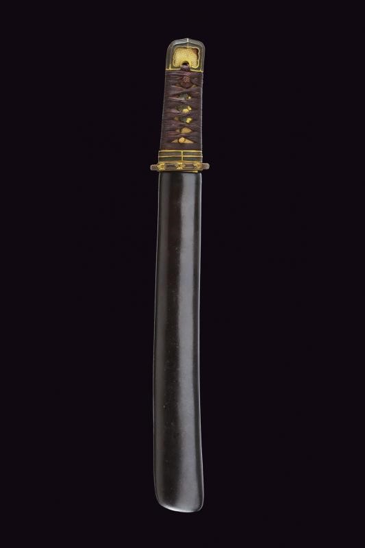 Straight balde (Nagasa: 23,8 cm), hamon: Suguha Notare, copper habaki. Nakago Kurijiri, yasurime Kiri, two mekugi-ana. Small, oval tsuba in blackened shakudo with gold leaf decoration. Fuchi-kashira handachi, menuki with partially gilded flowers. Simple saya made of black lacquered wood. Middle Edo period, late 18th century.