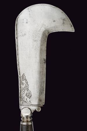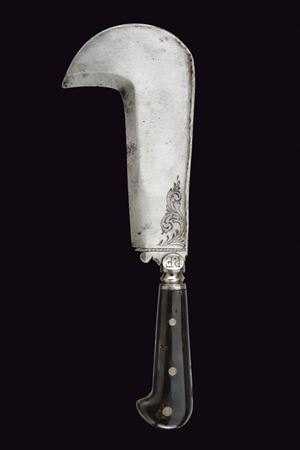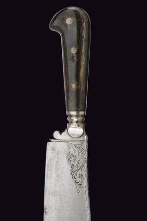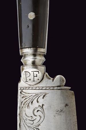 Wide straight single-edged blade with curved tip, back with slightly raised edge, base engraved with floral scrolls. Carved tang; iron guard with two symmetrical cups, the base stamped "P.F." Horn grips (small defects) with angled ends, rivets, and smooth iron bands.