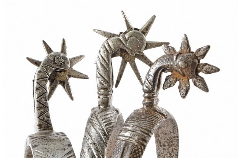 All different, made of iron, carved with geometric motifs, one with articulated sides.