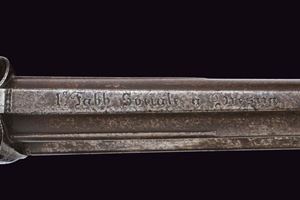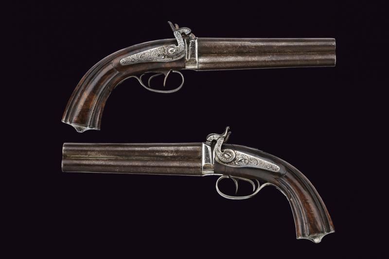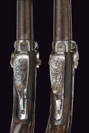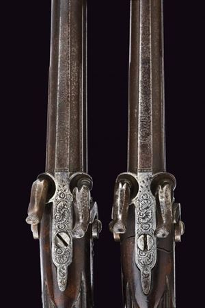 Round, smoothbore, over-and-under, 13.5 mm cal. barrels, provided with a band featuring the inscription "1° Fabb Sociale a Brescia"; surface with encrustments. Tang engraved with plant motifs. Percussion lock with backward spring lock, lock plates and cocks completely engraved with floral motifs and shells. Wooden butts (one with a broken part in the lock area) sculpted with grooves. Beautiful faceted and engraved iron butt-plates. Trigger guards decorated en suite.