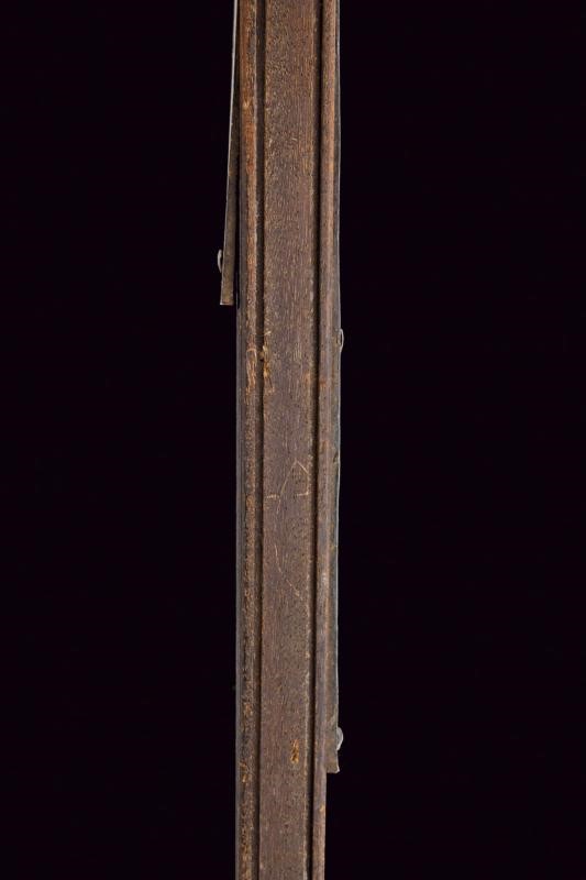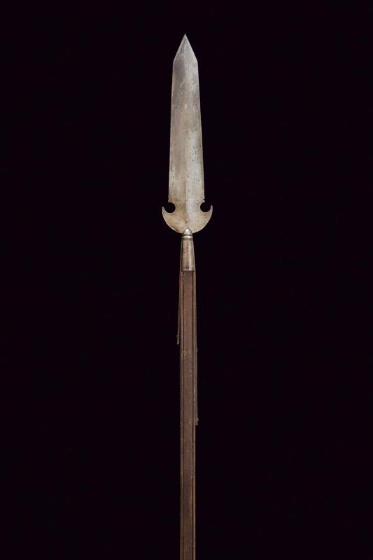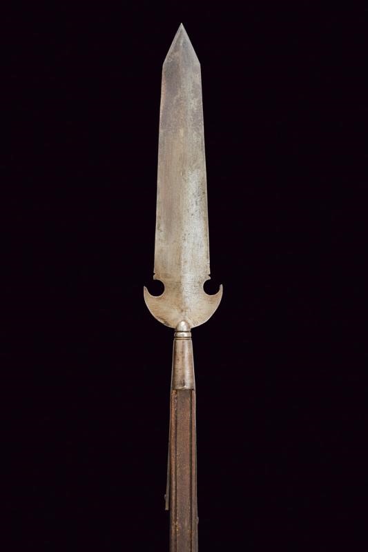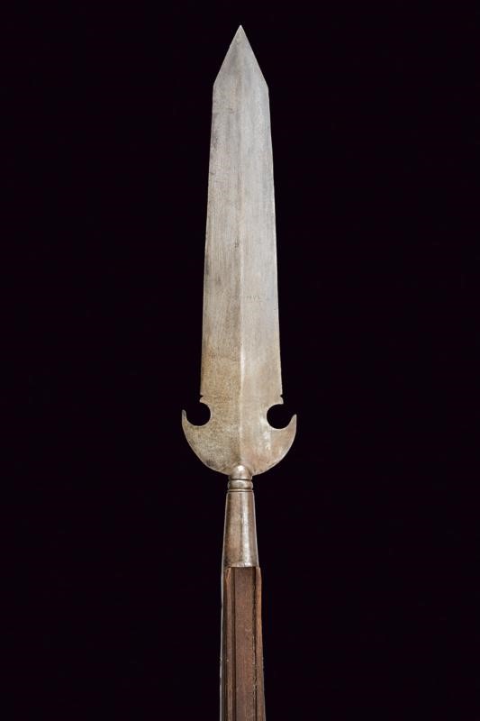 Wide, flat, iron cusp, with crescent-shaped wings at the base; ferrule shaped as a truncated cone, with flat straps probably shortened on a modern wooden shaft. Used by papal guards.